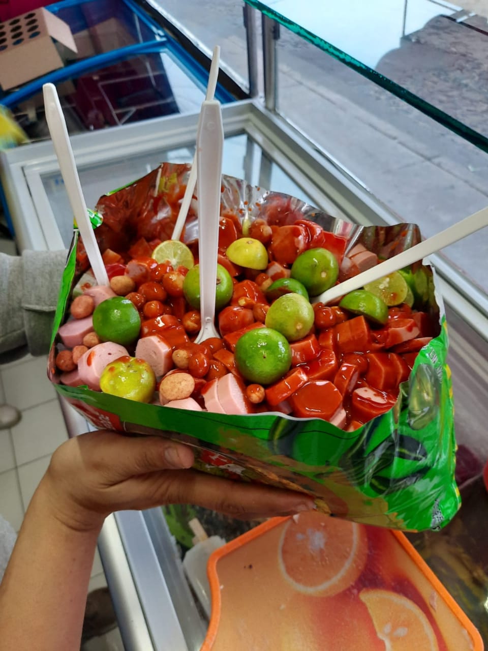 PREPARADOS CON JICAMA, PEPINO, SALCHICHA, CUERTITO, CACAHUATES Y AL GUSTO SAL LIMON CHILE Y CHAMOY