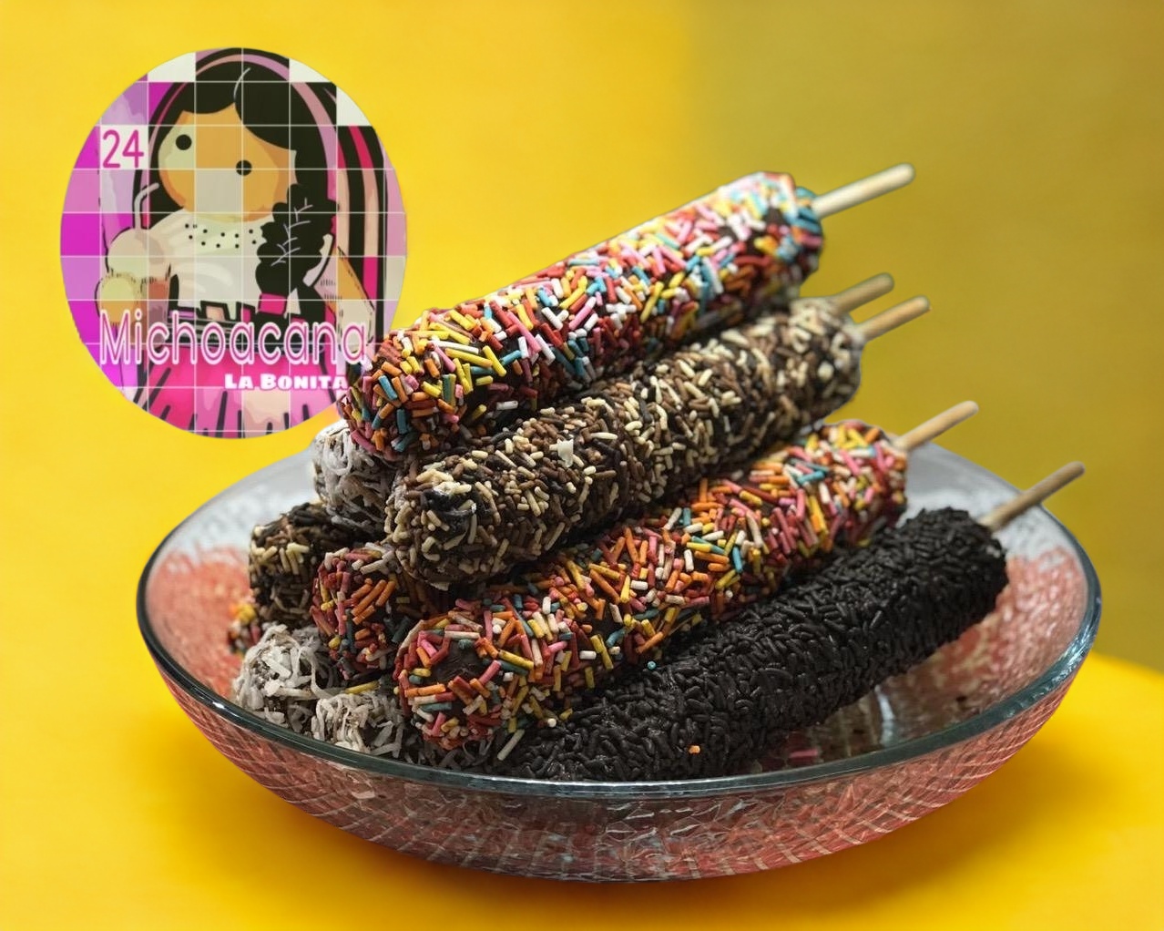 Exquisita pulpa de plátano 100% natural moldeada cilíndricamente, bañada en delicioso chocolate de calidad, y cubierta a elegir.