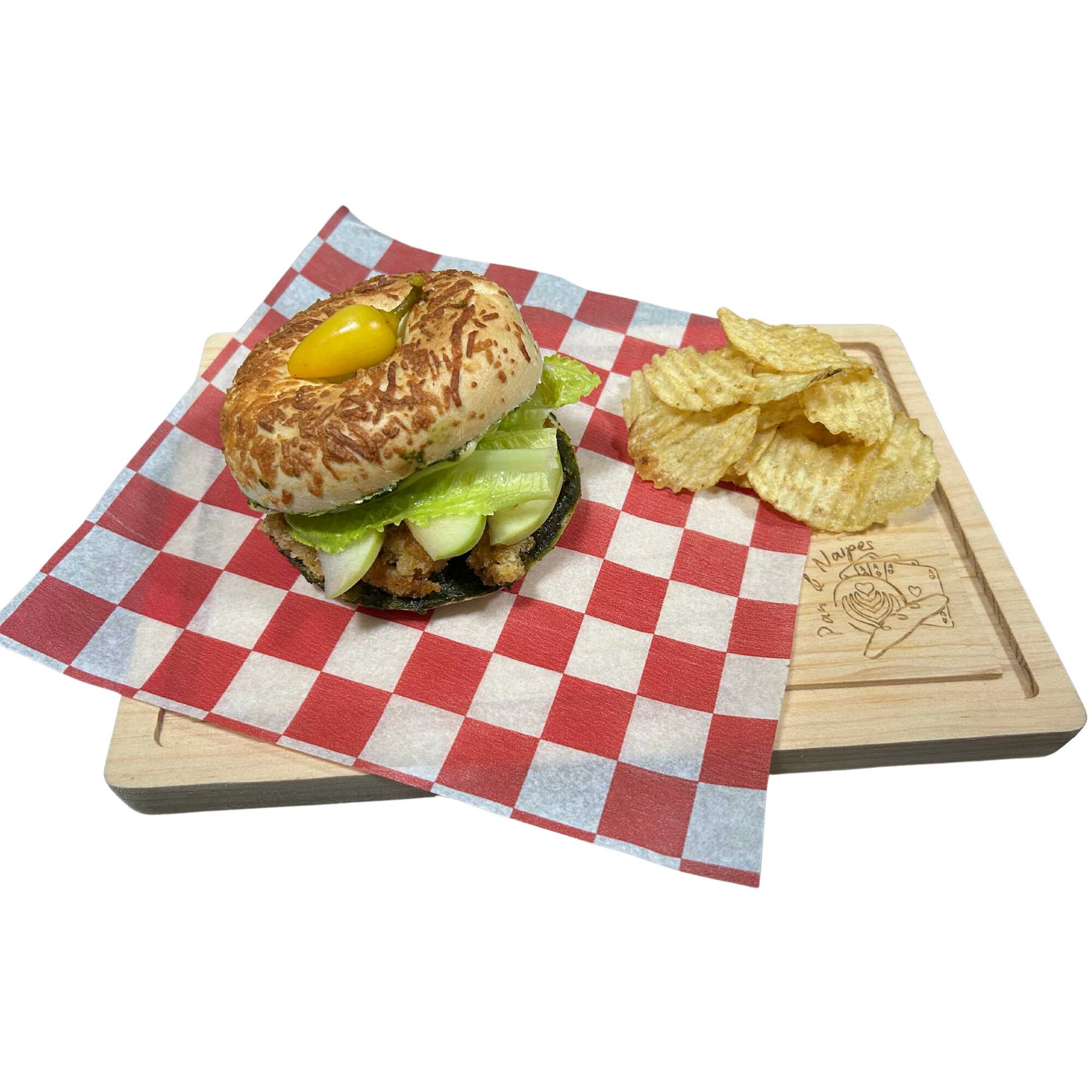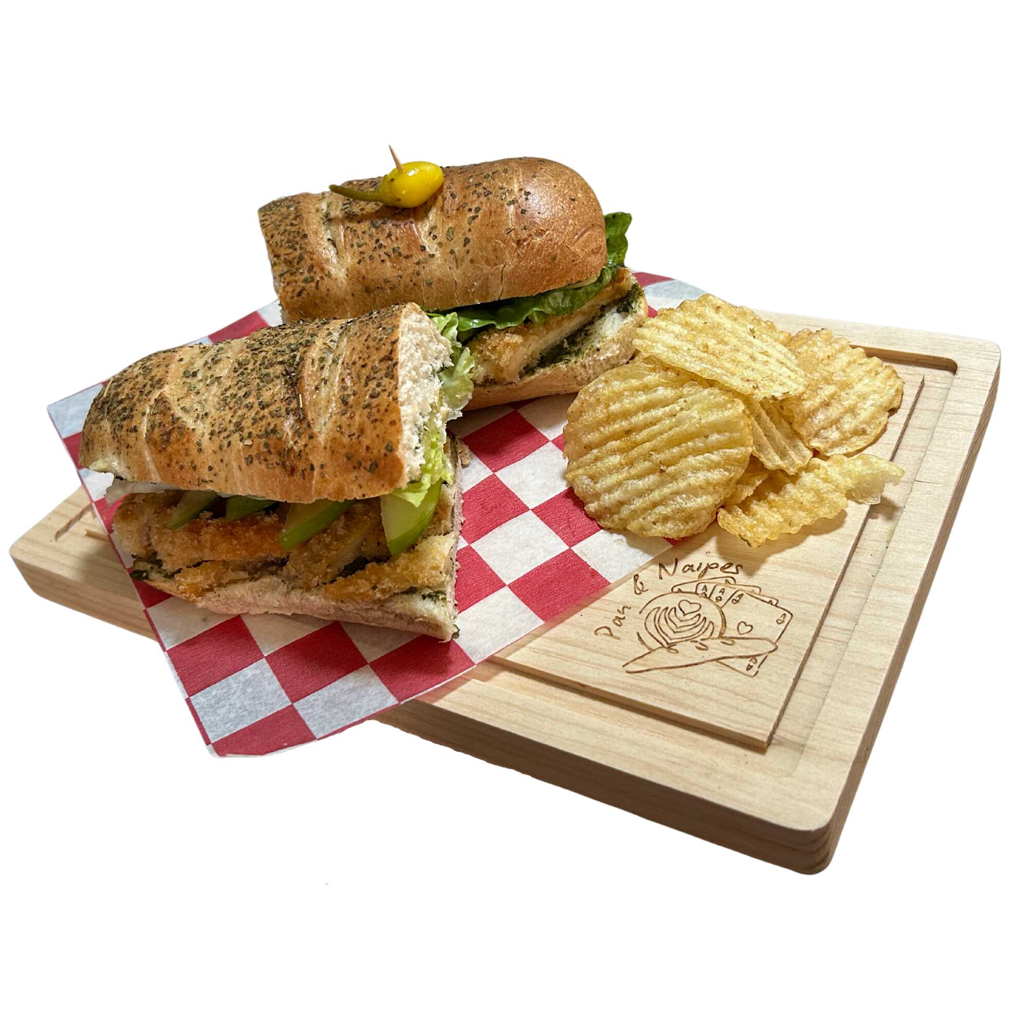 Pan de masa madre, pesto, pechuga empanizada, lechuga, manzana verde, queso