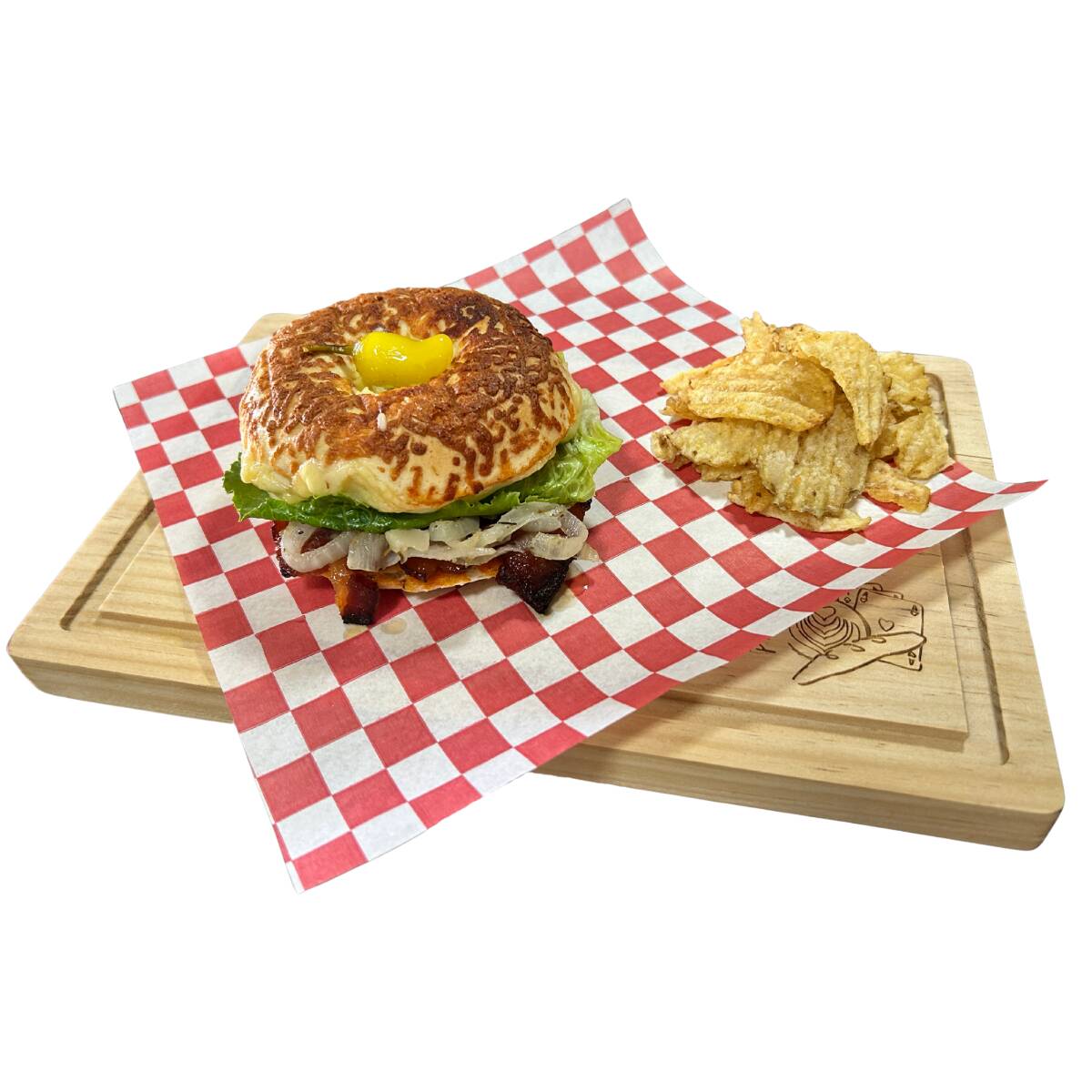 Pan de masa madre, confit de tomate cherry, tocino enmielado, cebolla caramelizada, lechuga, queso