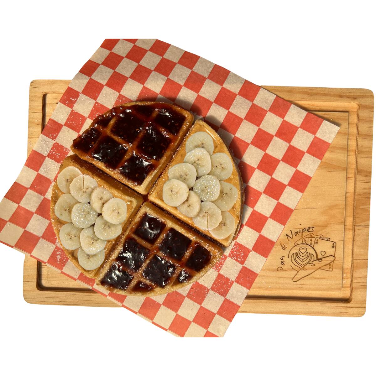 Waffle de vainilla, crema de cacahuate, mermelada y plátano