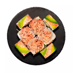 (12 pza) sushi con pepino, aguacate, philadelphia y surimi por dentro, envuelto en camarón.