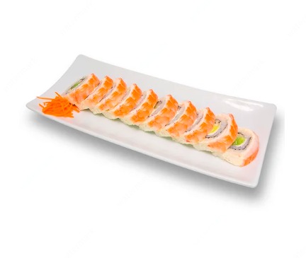 (12 pza) Pepino, aguacate, philadelphia por dentro, envuleto en salmon hornado, acompañado de topping smoke, bañado en salsa de anguila.