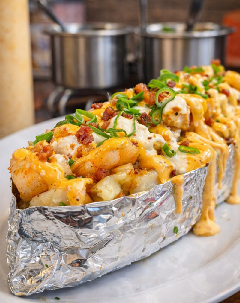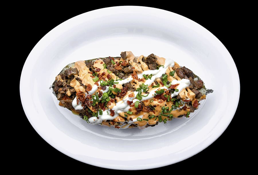 La estrella de nuestra casa con un exquisito aderezo de chipotle, barniz de mantequilla, toque de pimienta, crema, queso, tocino y cebollín (338g)