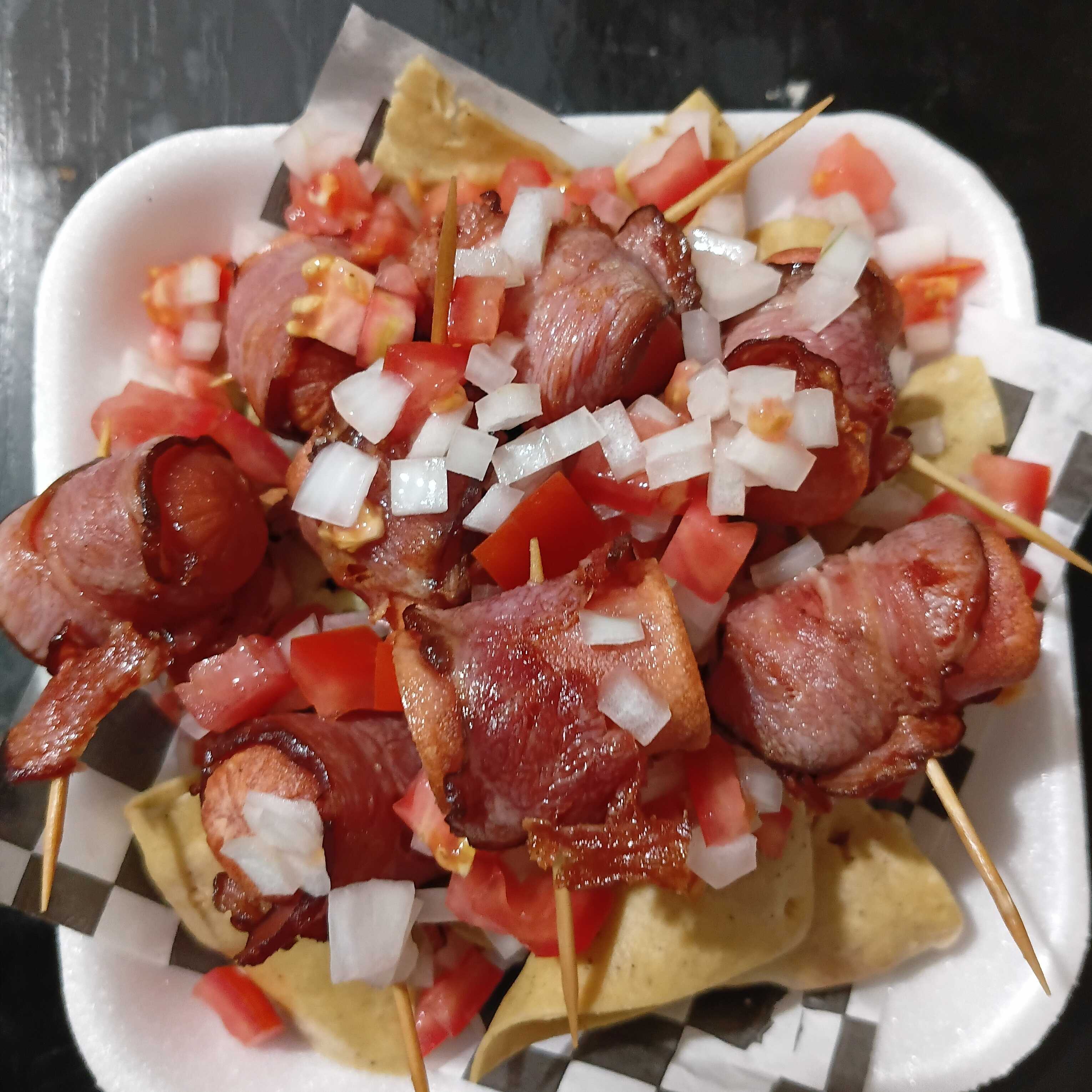 Ingredientes salchicha envuelta en tocino, acompañada por un pico de gallo (cebolla, jitomate picado) aderezos de su elección capsu, crema, mostaza y jalapeño