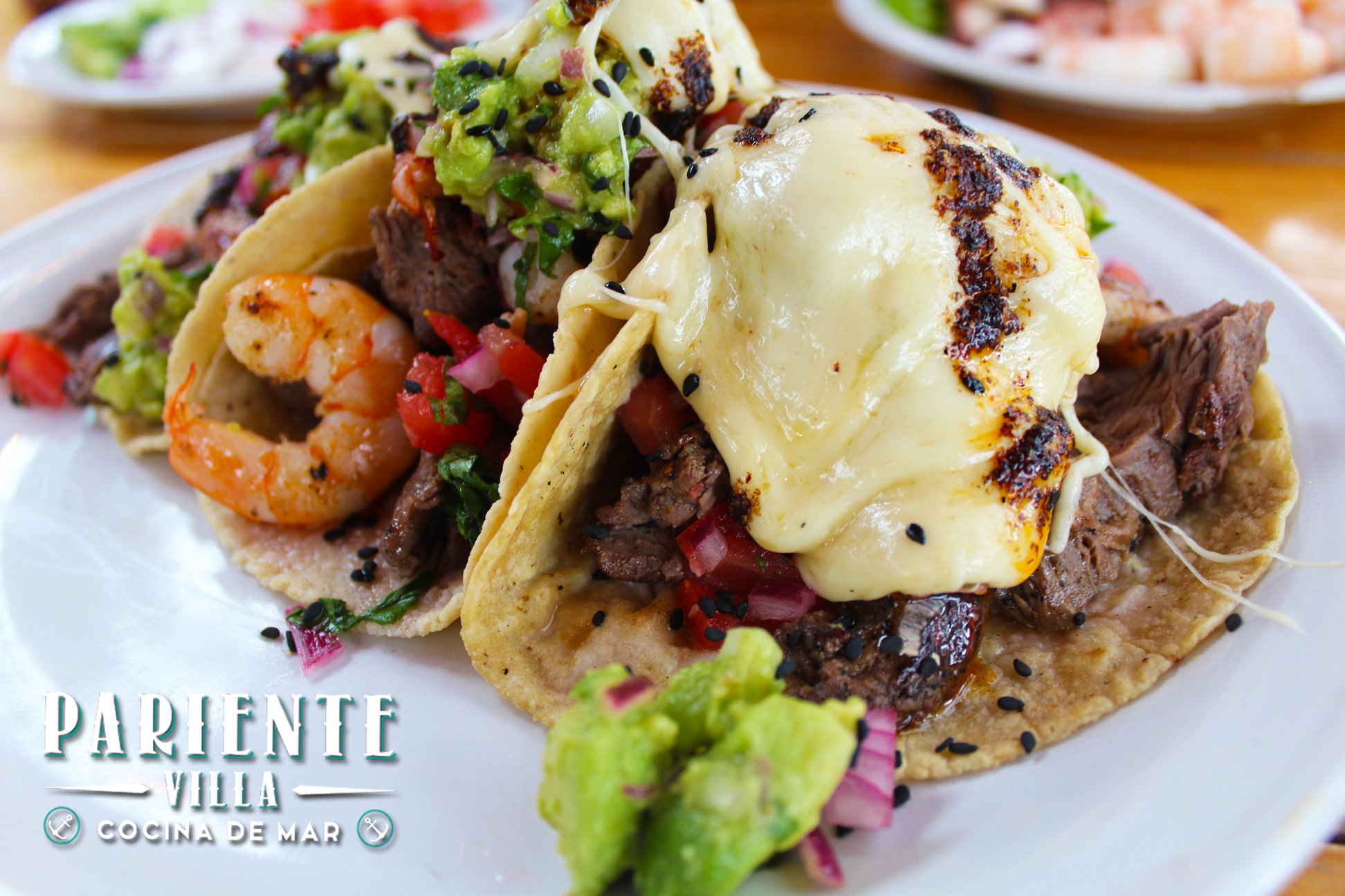 3 tacos de camarón coronado con queso.