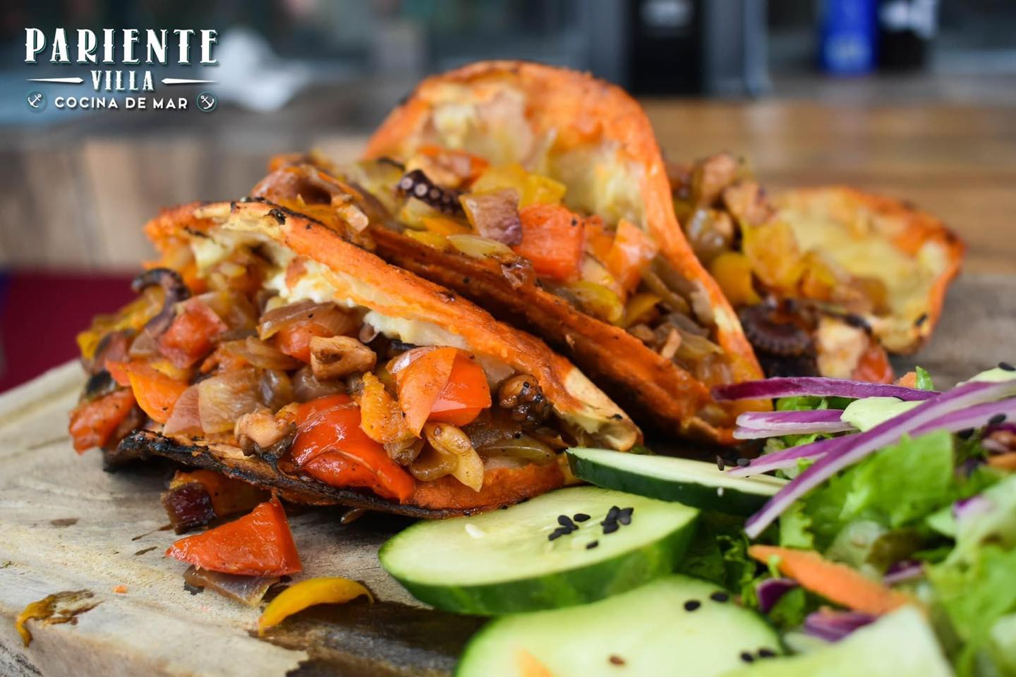 3 tacos de pulpo, pimientos y queso.