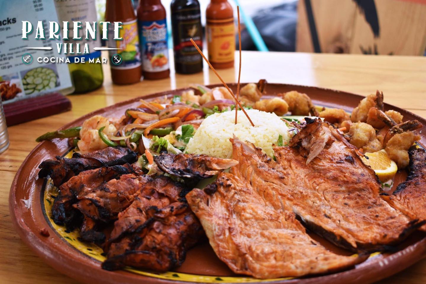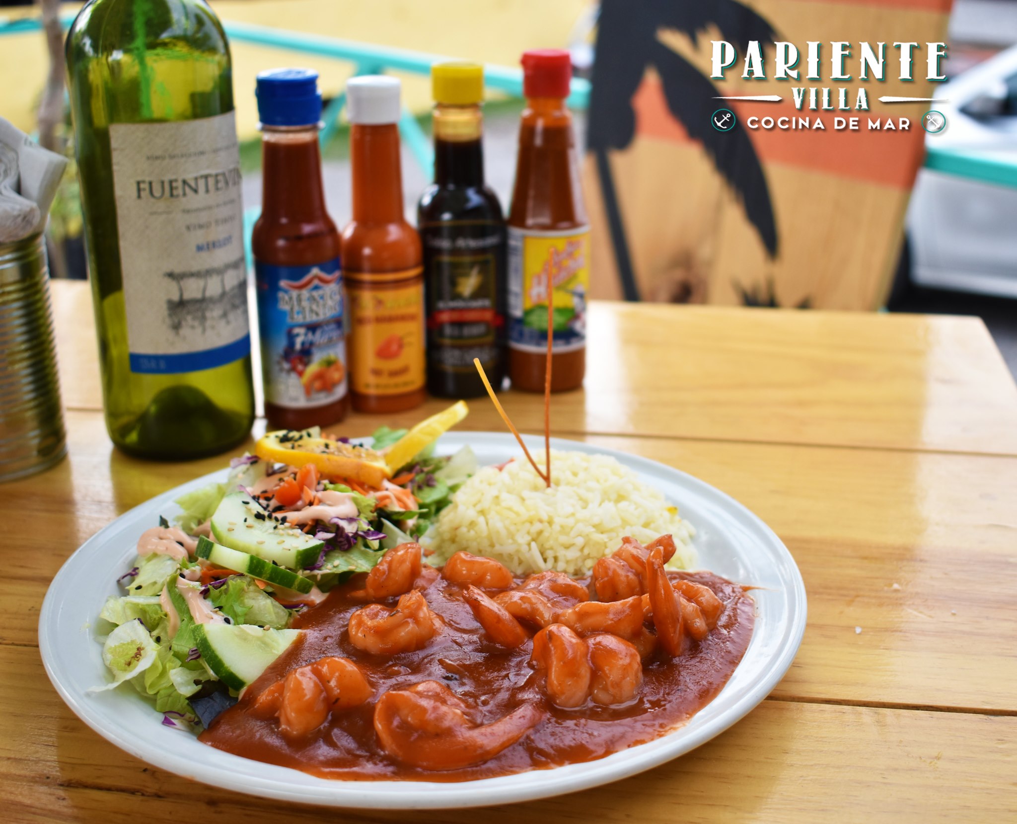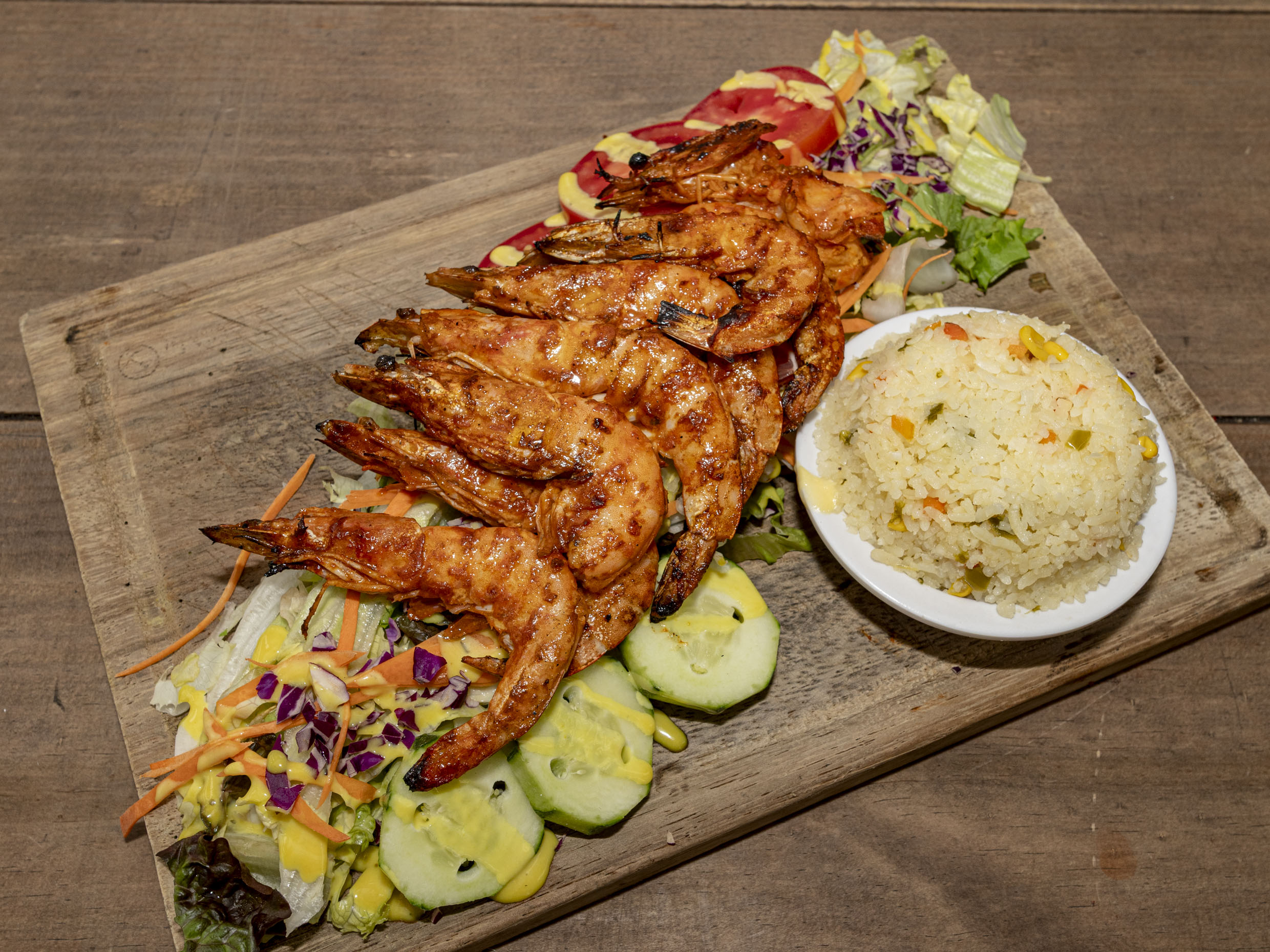 Camarones gigantes con cabeza y sin cascara a las brasas, salseados con un toque picosito ajo. Acompañados de arroz y ensalada.