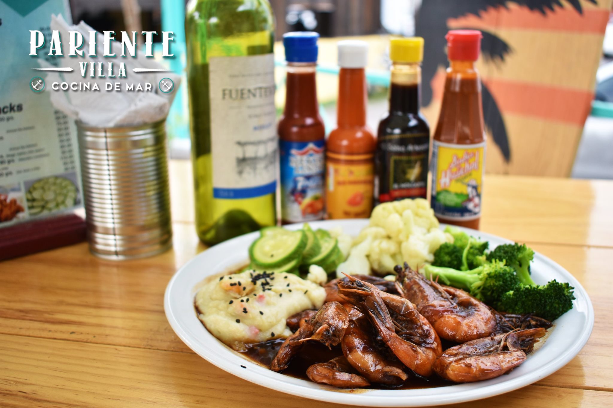 Camarones gigante con cabeza fritos, adobados en salsas negras de la casa. Acompañados de verduras al vapor y pure de papa.