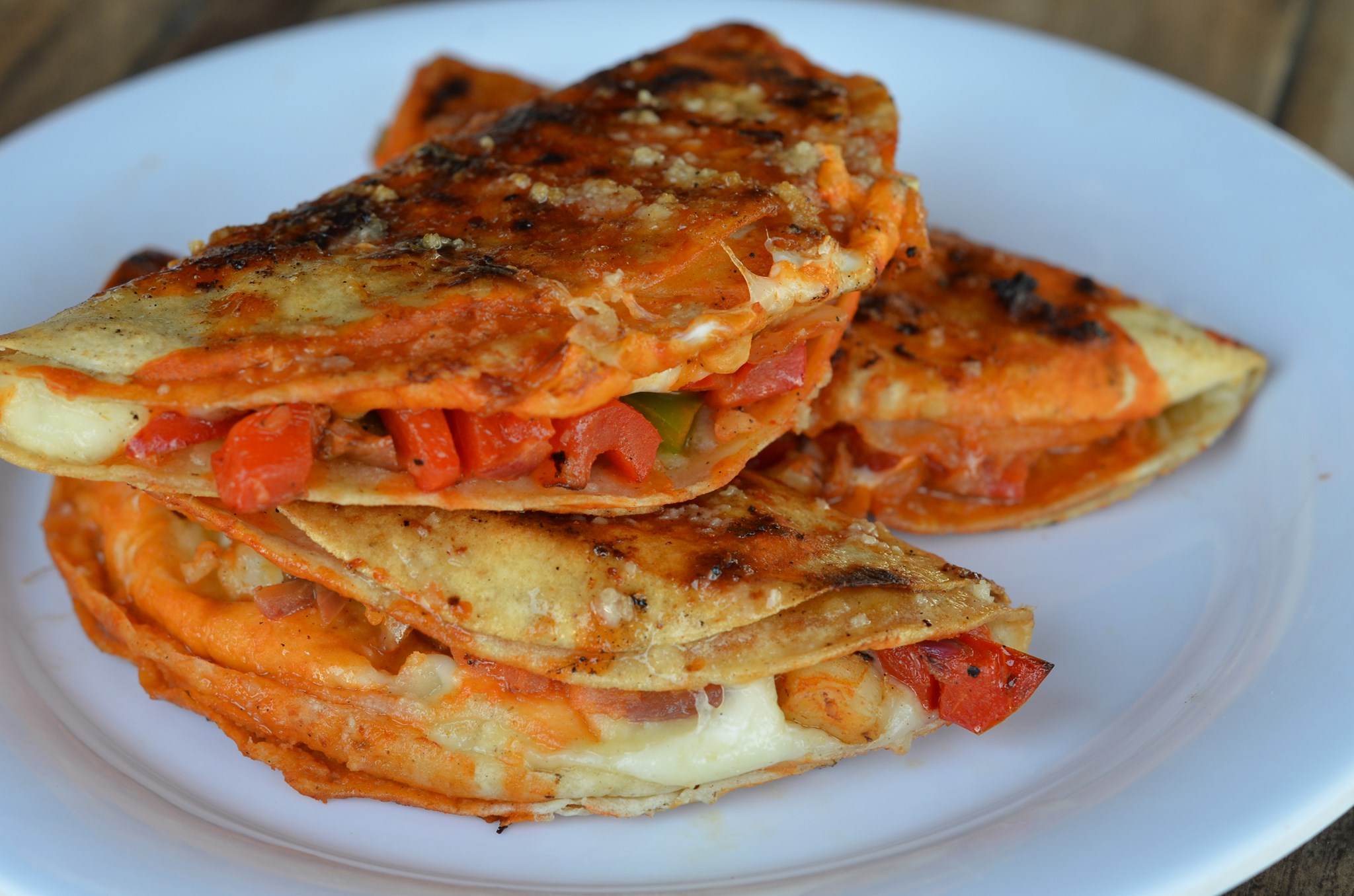 Tortilla de maíz con camarón, arrachera, salsa mexicana, guacamole basñada con queso fundido acompañados con cebolla guisada y Chile de aceite