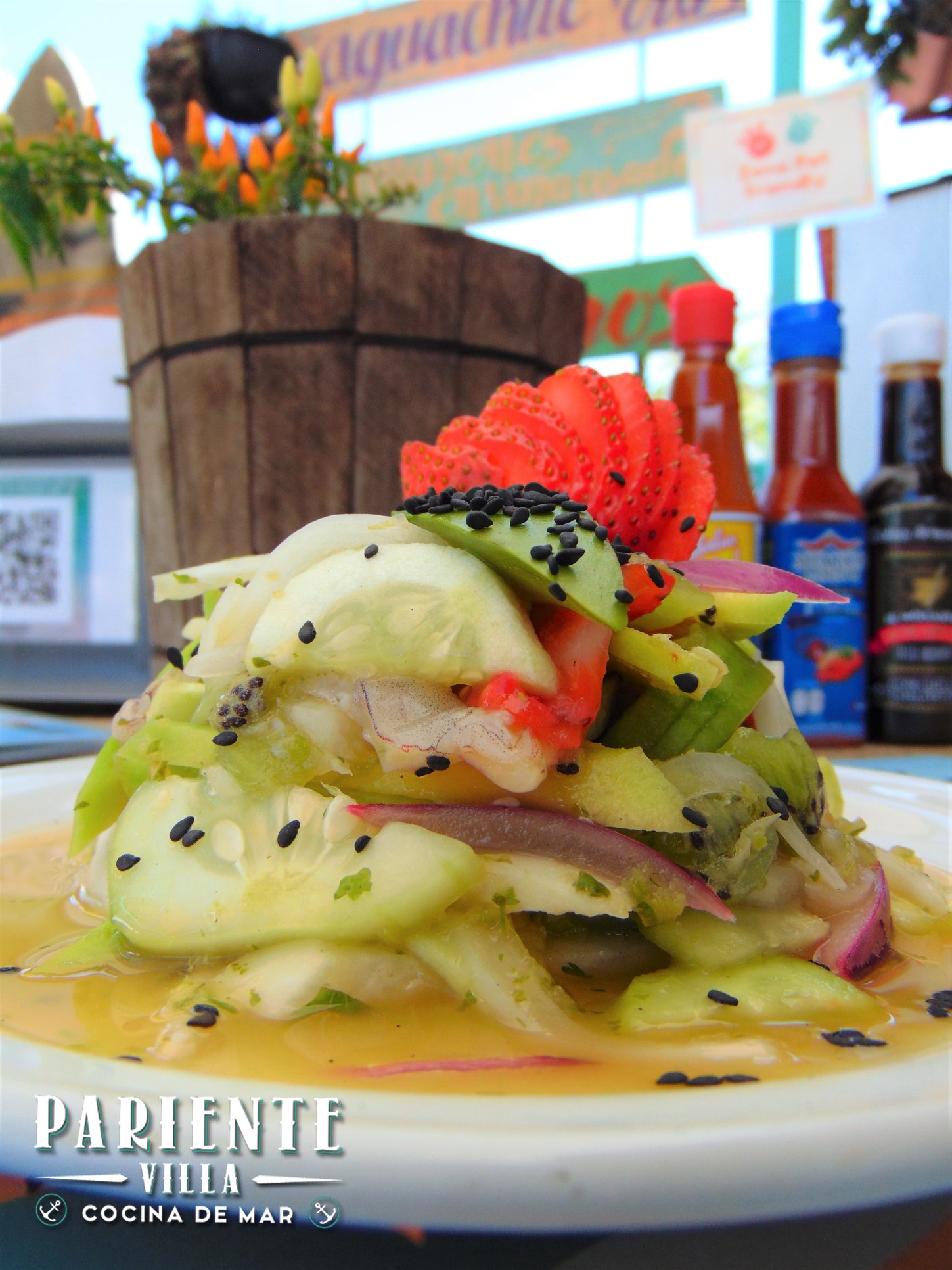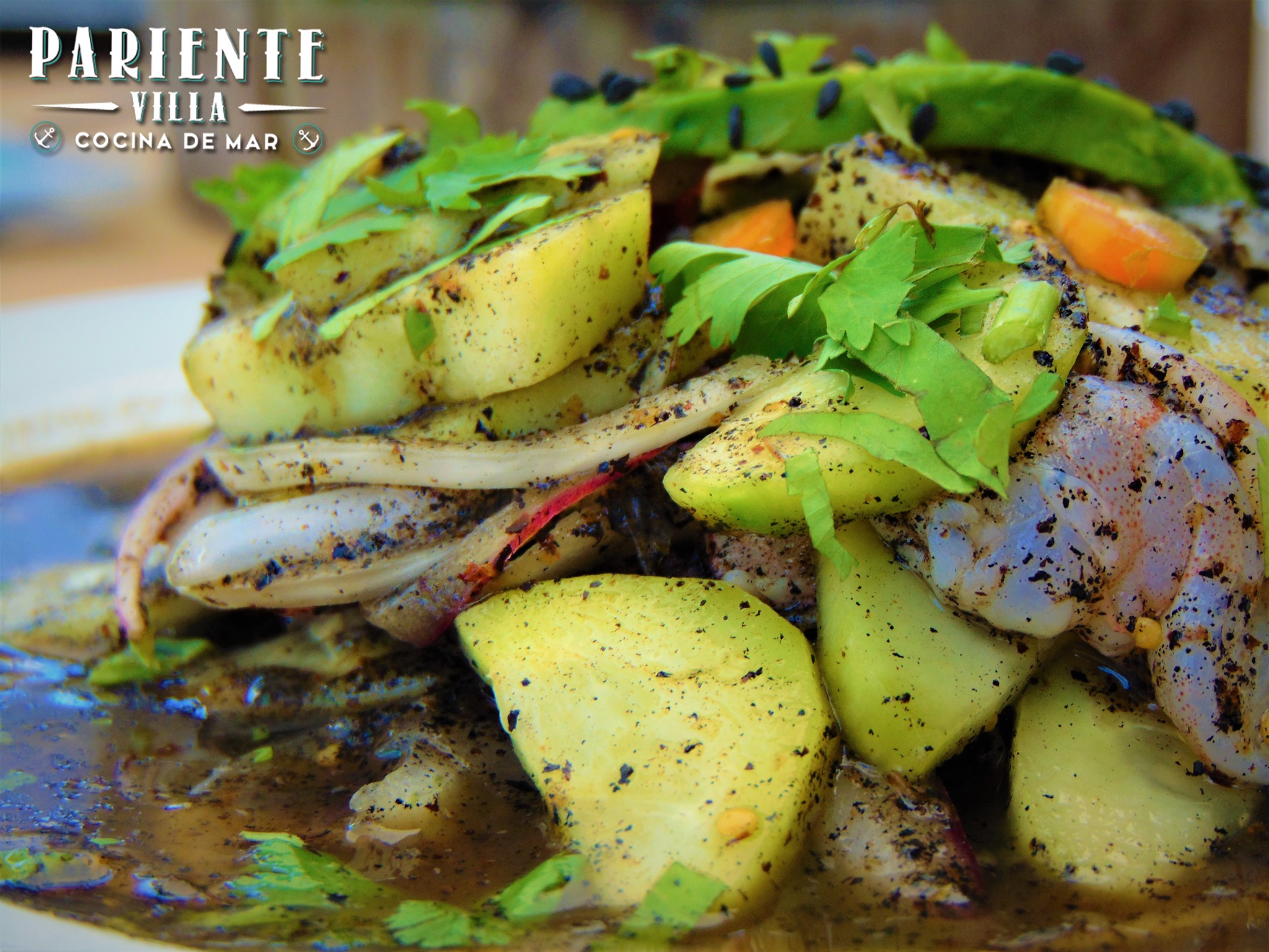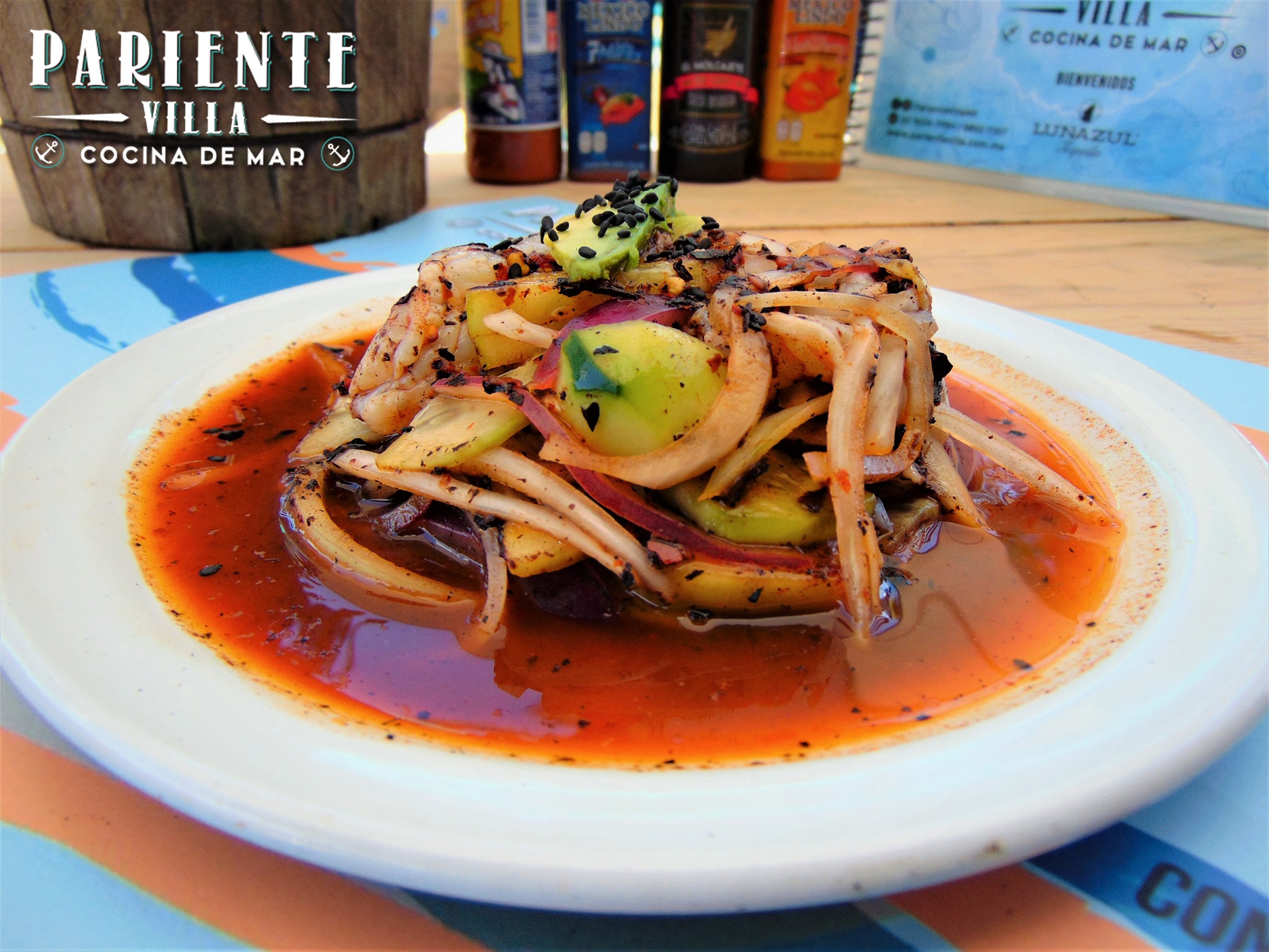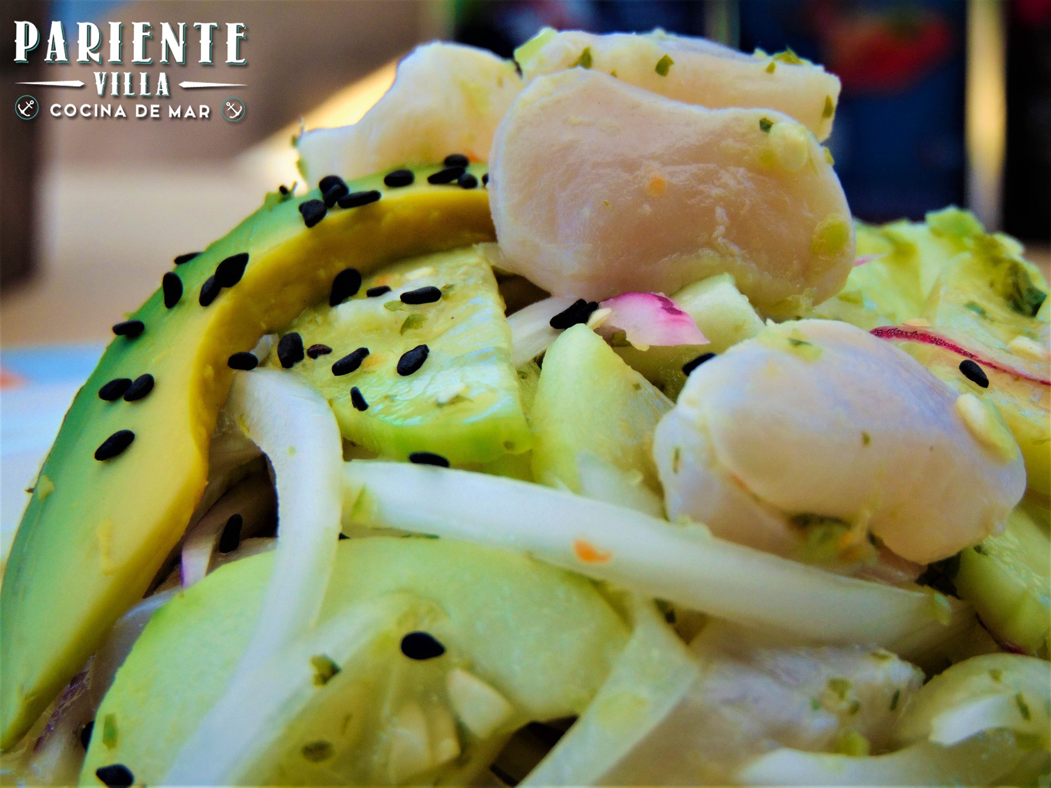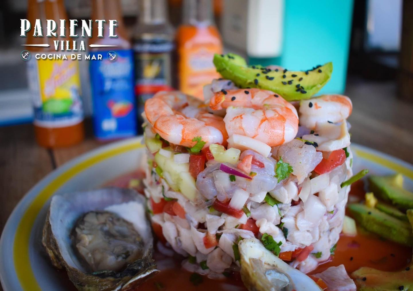 Base de ceviche de pescado, ceviche de camarón, pulpo, camarón cocido, ostión sazonado con una salsa de aguacate.