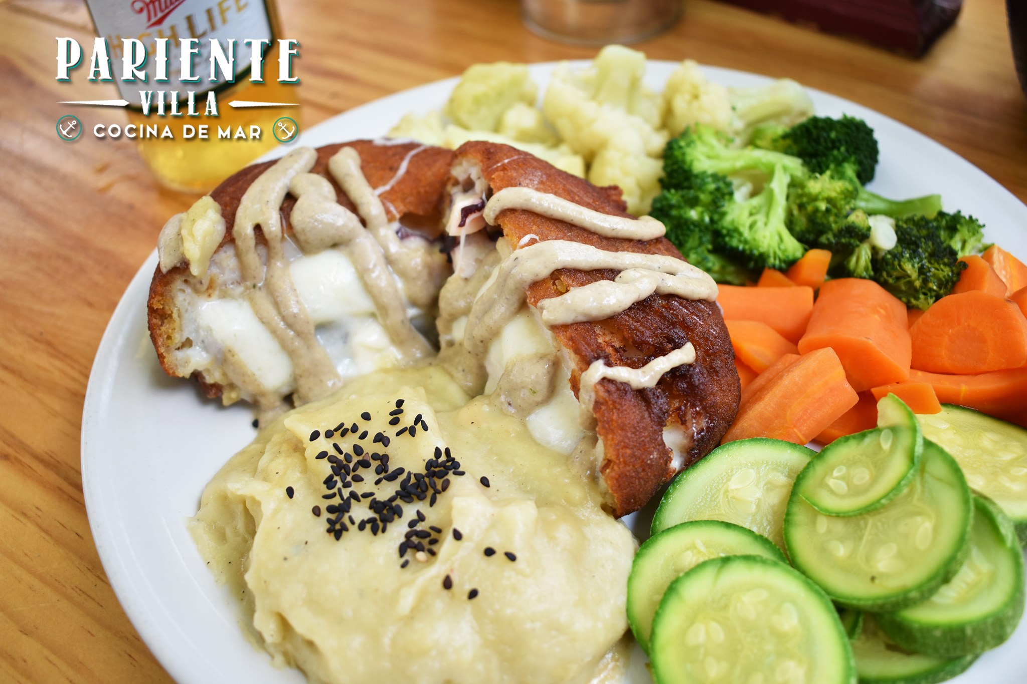 Filete empanizado con camarón, pulpo y queso bañados en salsa de champiñones.