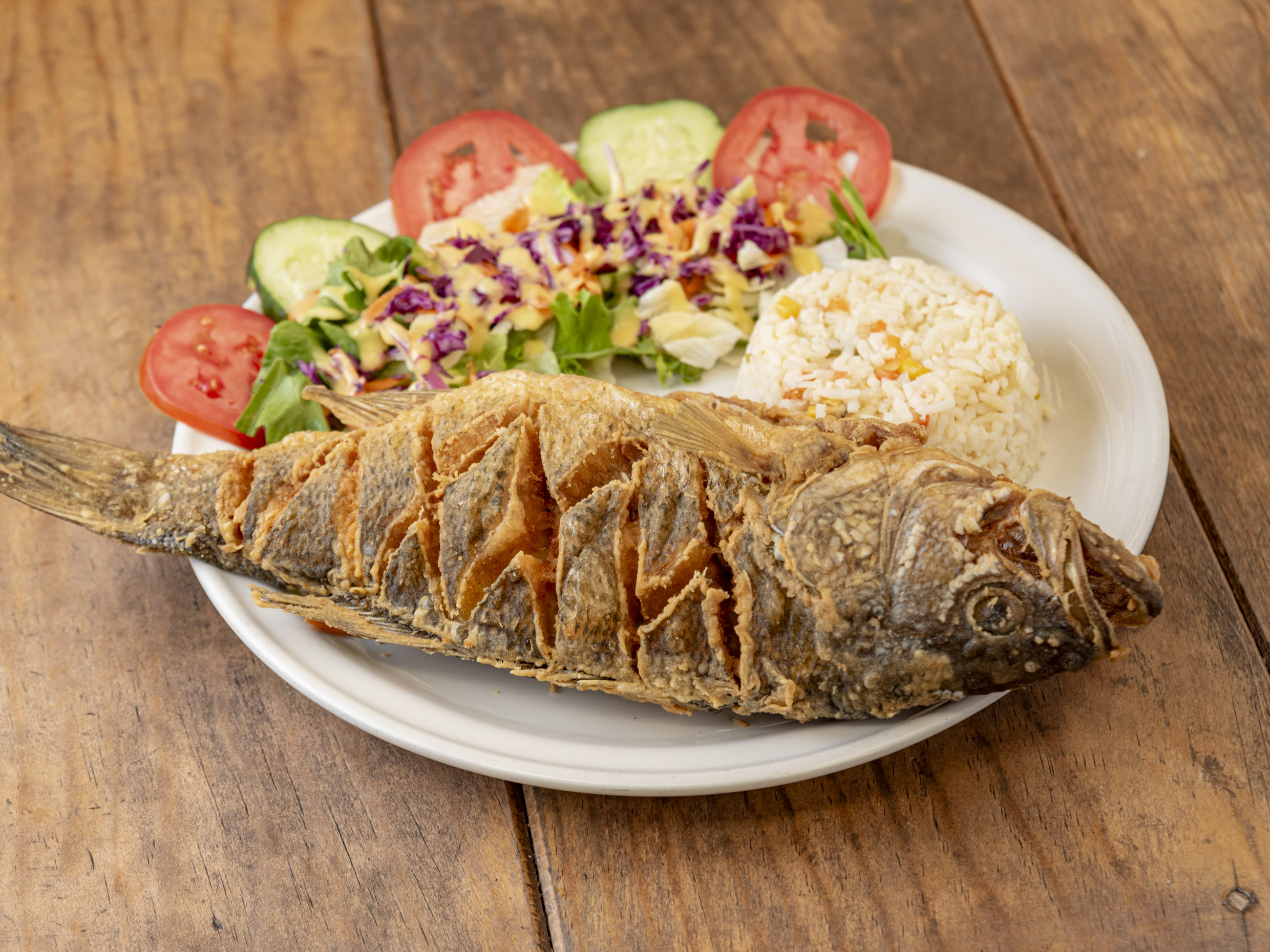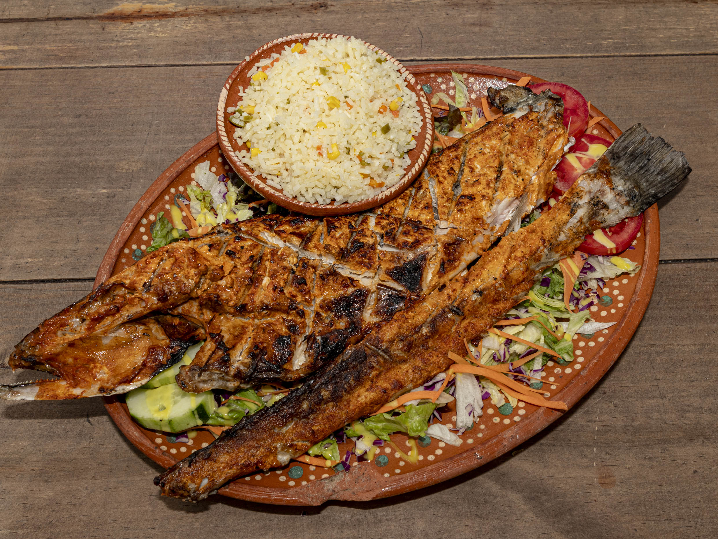 1/2 kg Pescado a las brasas salseado con toque picosito y ajo. Acompañados de arroz y ensalada.