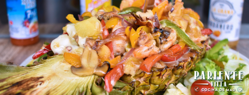 Camarón, pulpo, piña, pimientos y cebolla guisados con salsa de la casa y queso gratinado montado sobre una piña asada.