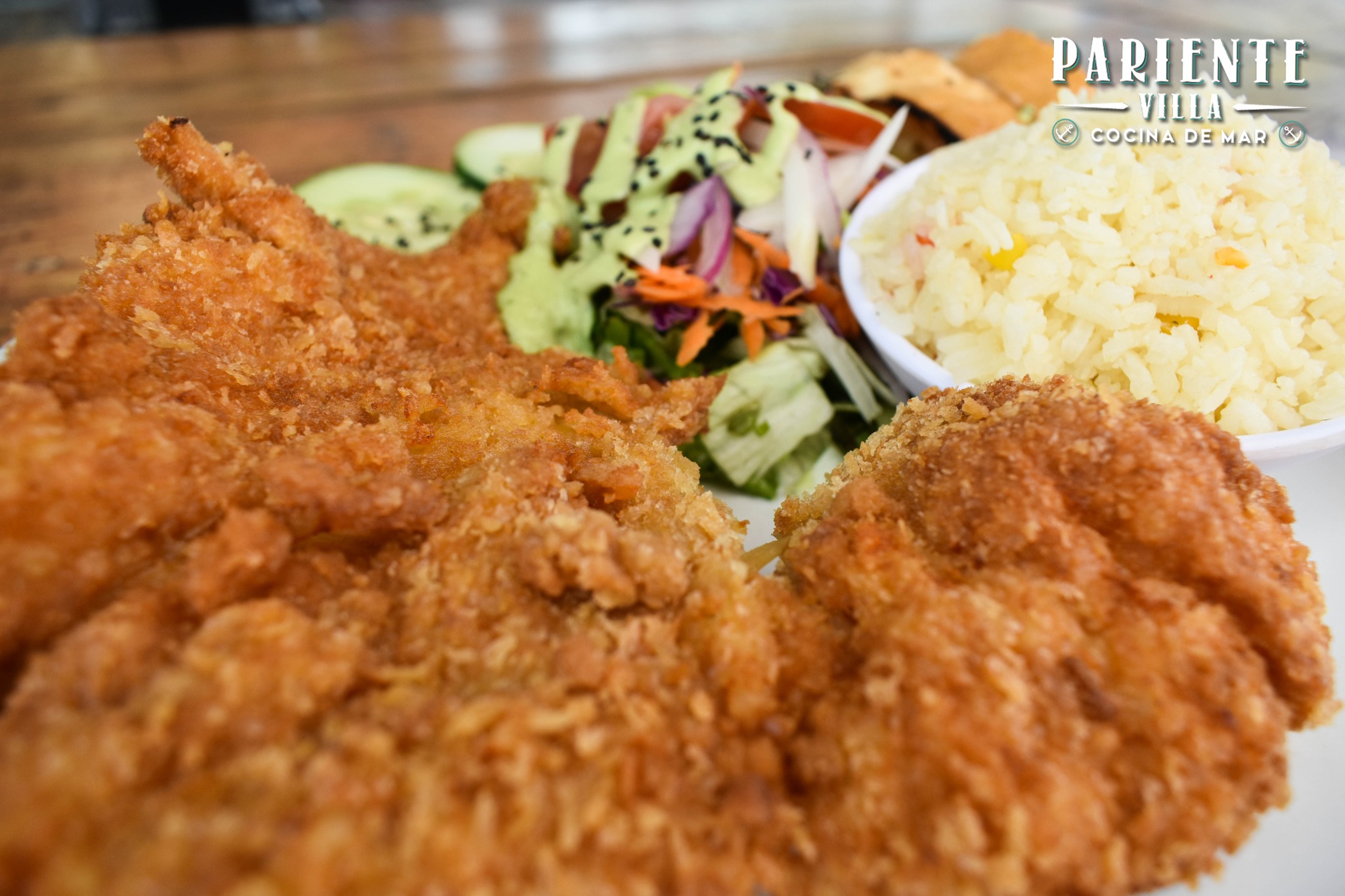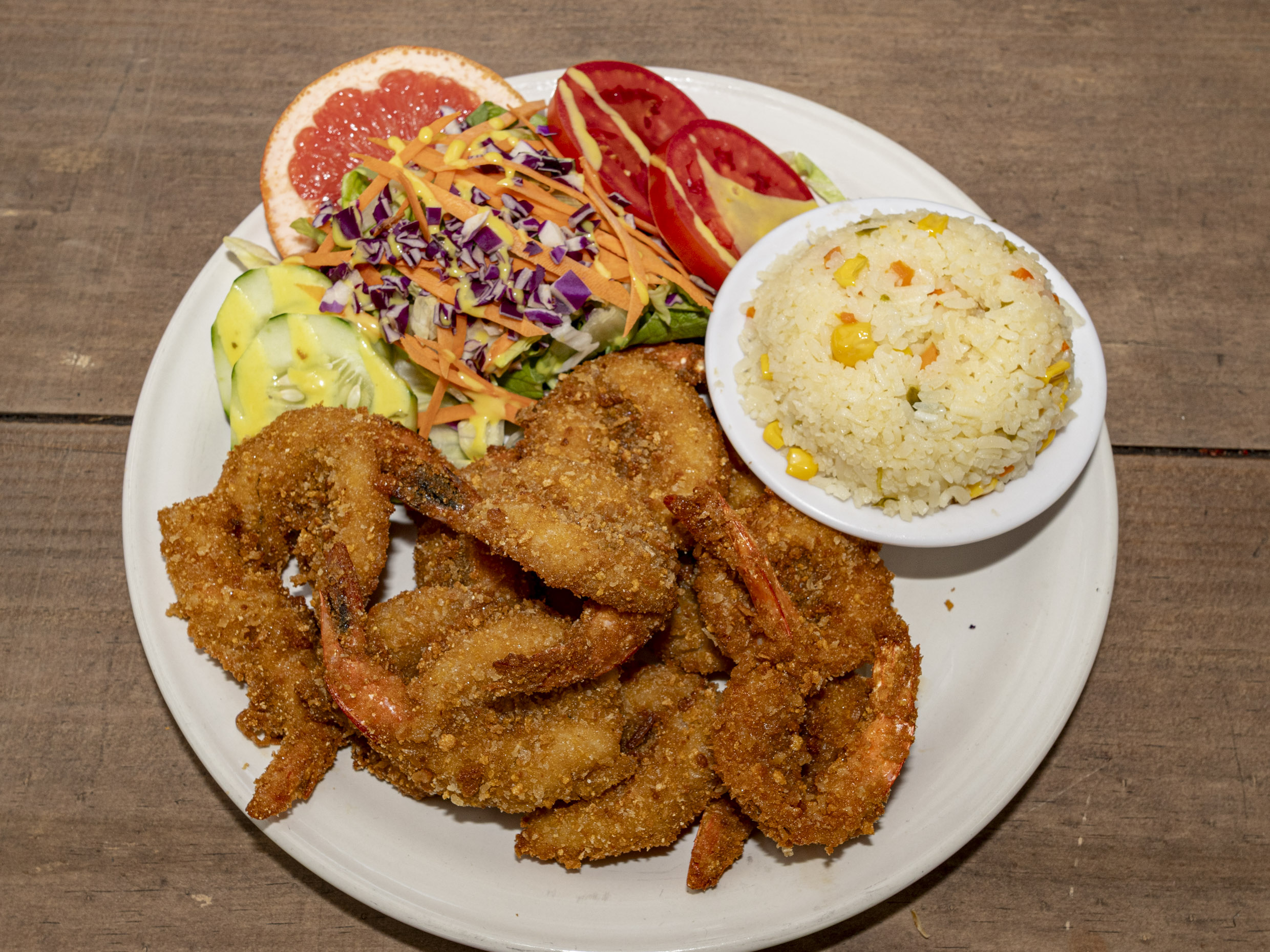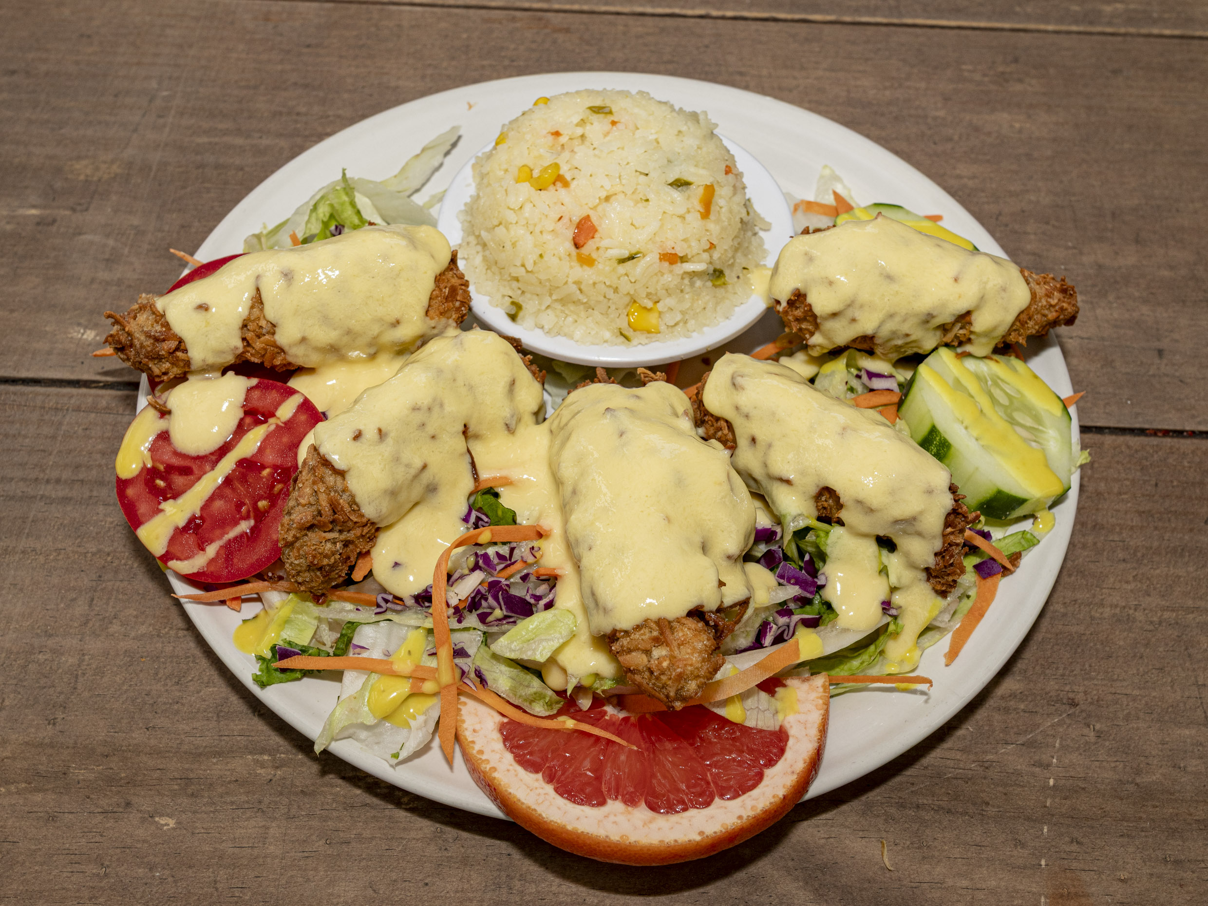 Camarones rellenos de queso philadelphia, empanizados en coco rayado fritos y bañados en salsa de mango. Acompañados ensalada fresca y arroz.
