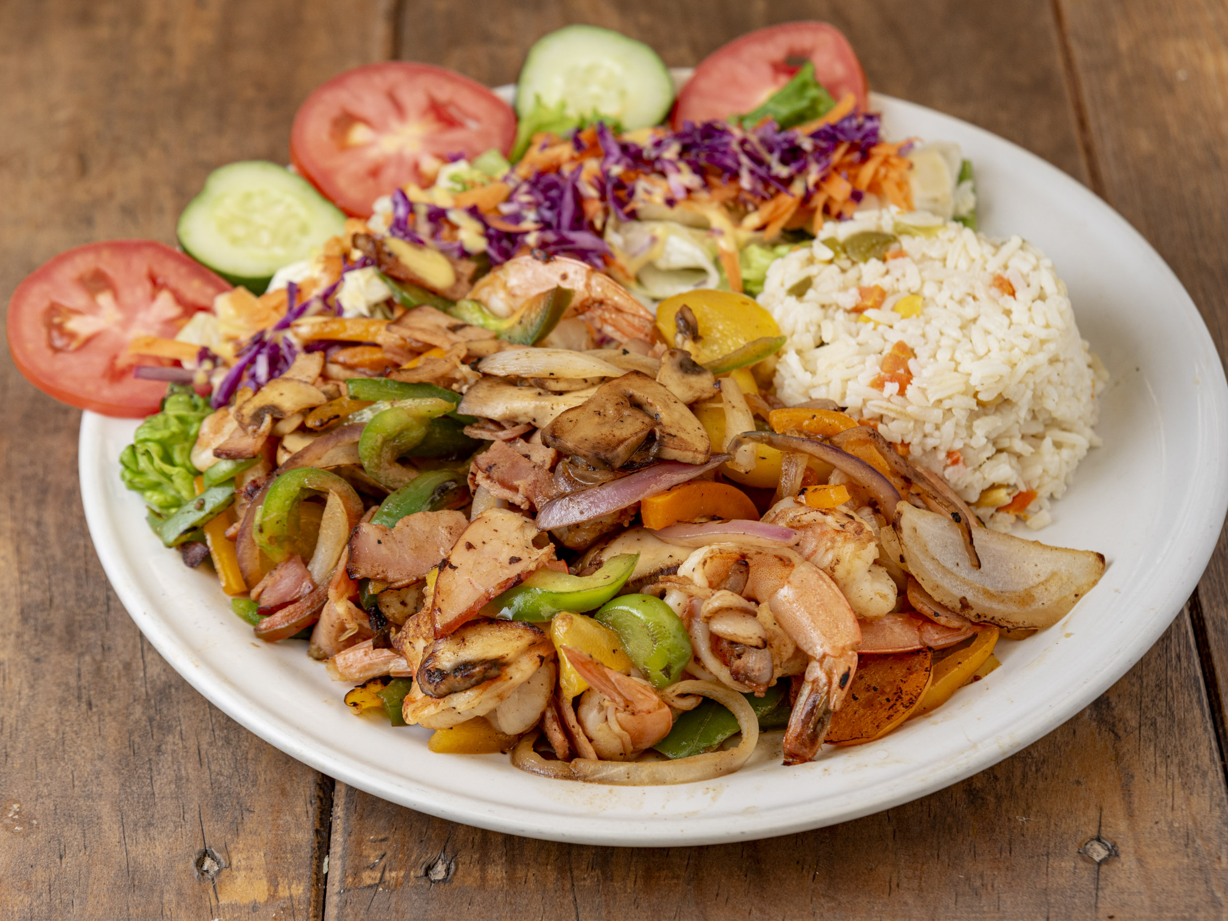 Camarones sateados con pimientos, cebolla, champiñón y tocino flameados con un toque de tequila.
