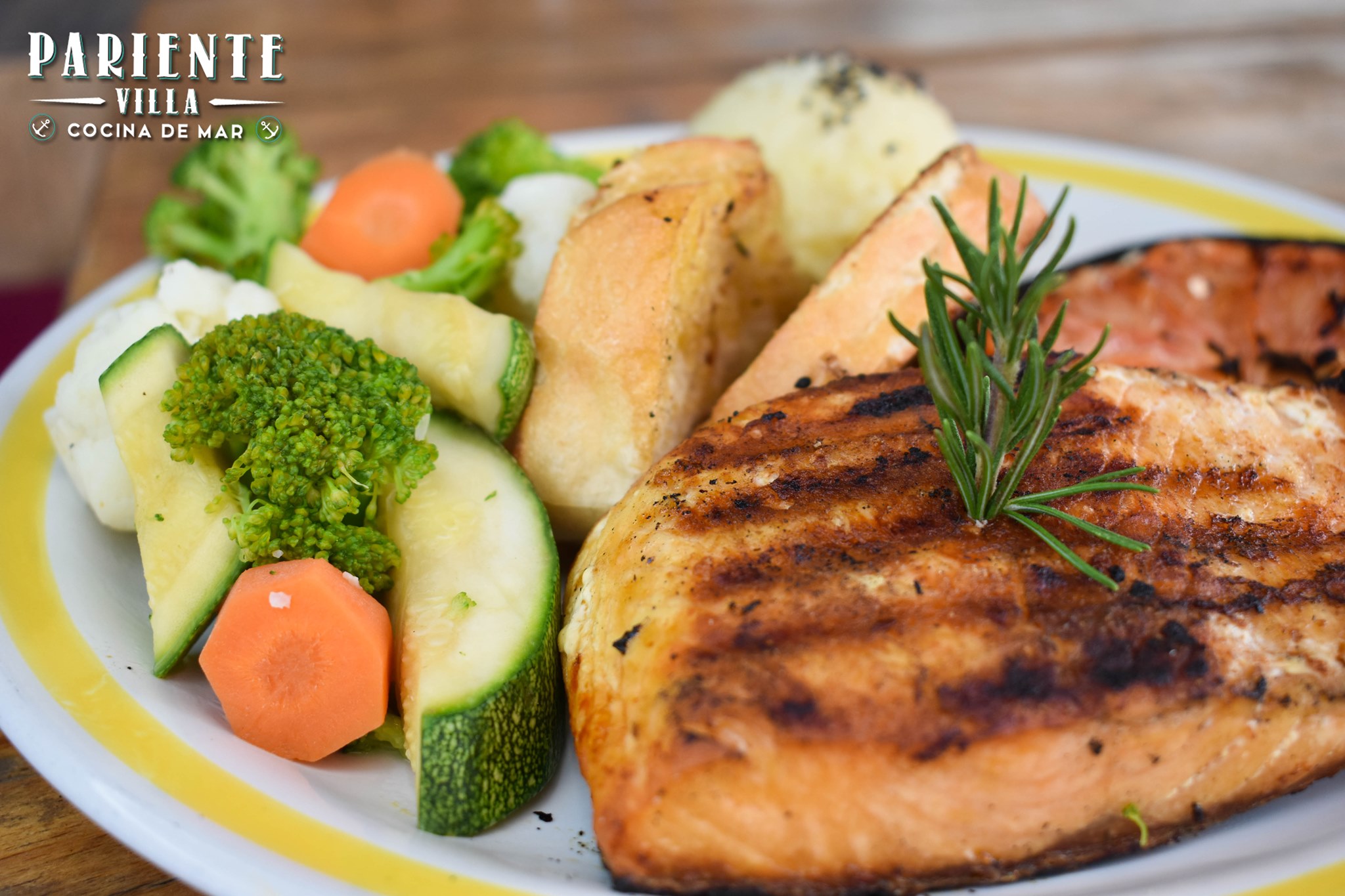 Medallón de atún a la parrilla, acompañada de papas gajo
