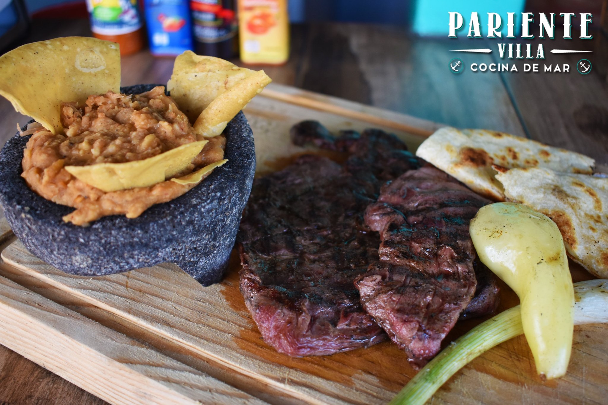 300 gramos, acompañado de frijoles refritos, quesadilla con tortilla de harina, chile güero y cebollitas cambray.