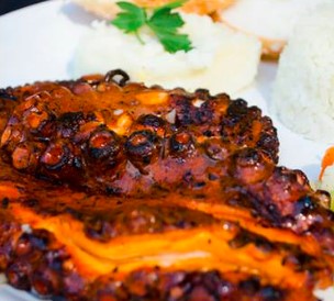 1/2 kg Pulpo a las brasas salseado con un toque picosito y ajo. Acompañados de arroz y ensalada.