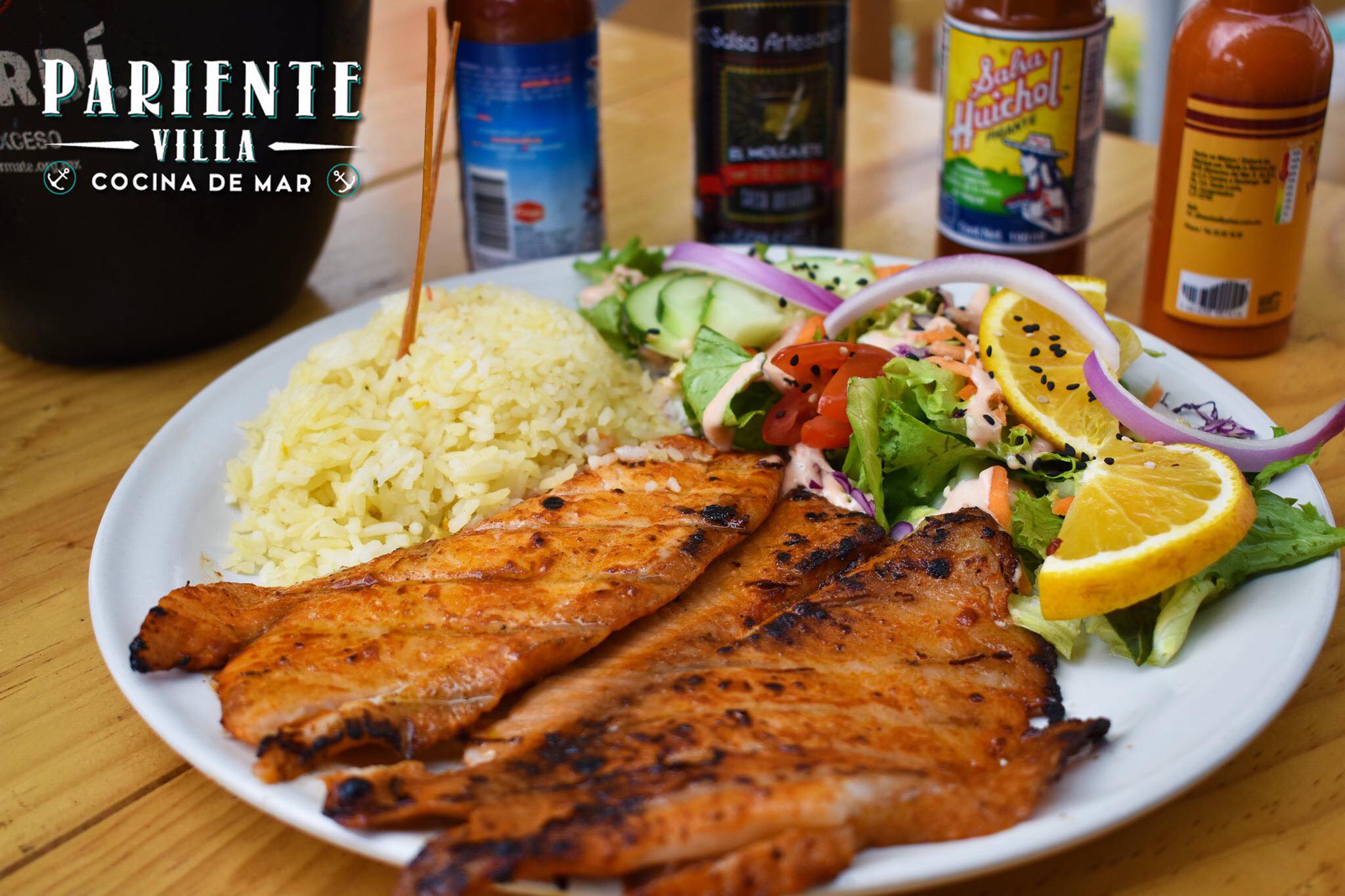 Filete al grill salseado con un toque picosito y ajo, acompañado de ensalada y arroz.
