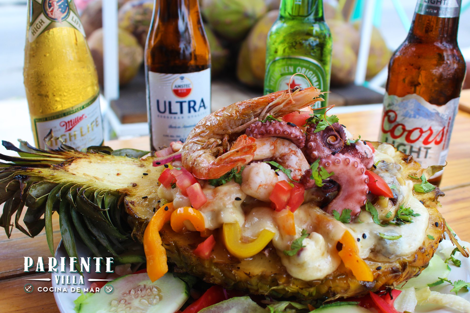 Camaron,pulpo,piña,champiñon,pimientos y queso gratinado montado sobre una piña asada.