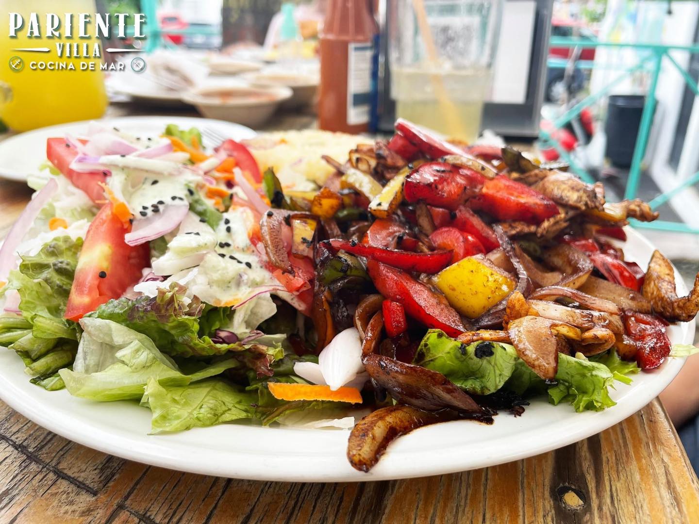 Arrachera o pollo salteados con cebolla, chiles morrones, sazonados con salsa negras y acompañadas con arroz y acompañadas con arroz y ensaladas.