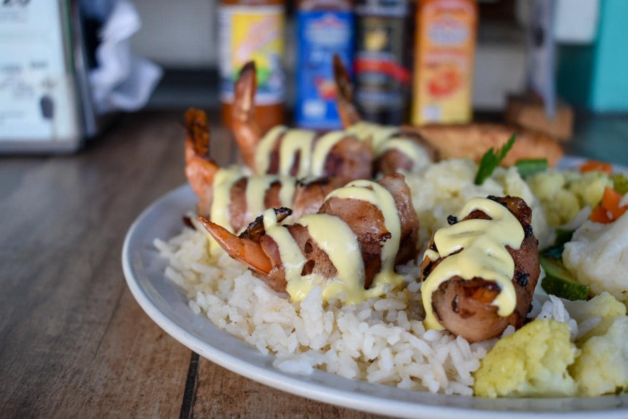 Camarones rellenos de queso manchego, envueltos en tocino, bañados en salsa de champiñón, acompañados de pure, verduras al vapor y arroz.