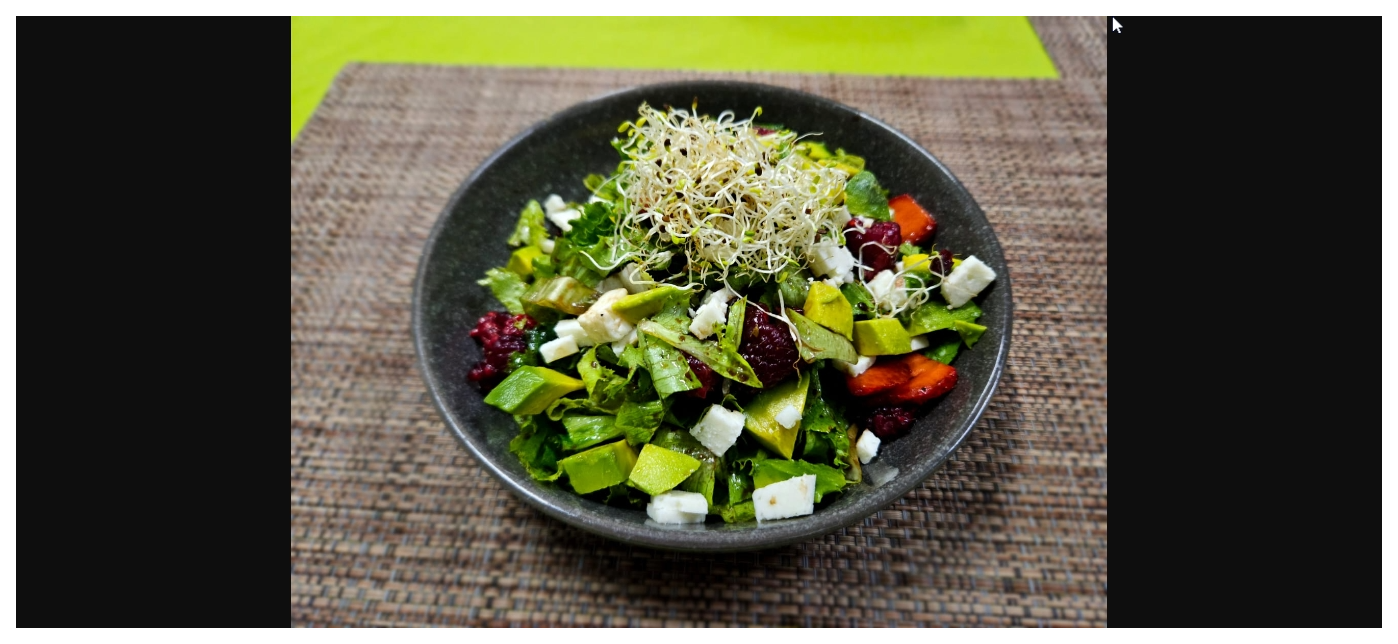 Una combinación lechuga con frutos rojos de temporada, cubitos de aguacate con una vinagreta balsámica y queso de cabra, frambuesa, zarzamora y fresa.