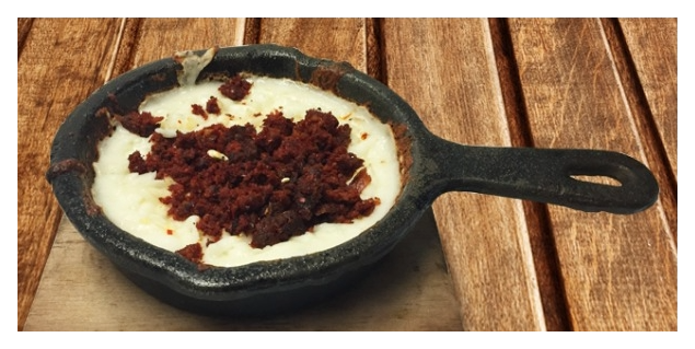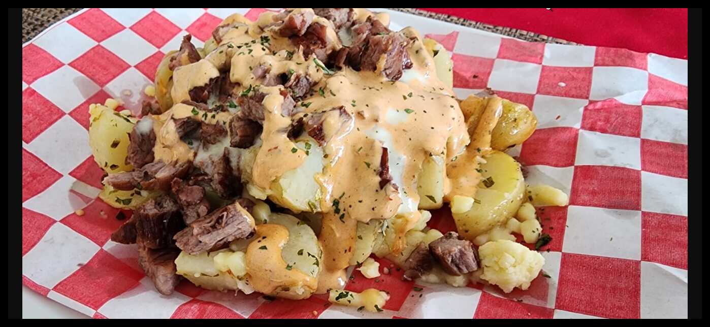 Papas cambray salteadas al chimichurri, con queso mozzarella, carne chorizo asadero, con un toque de crema de la casa, aderezo chipotle, salpicada de perejil, 160 g de carne.