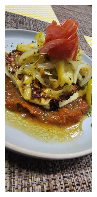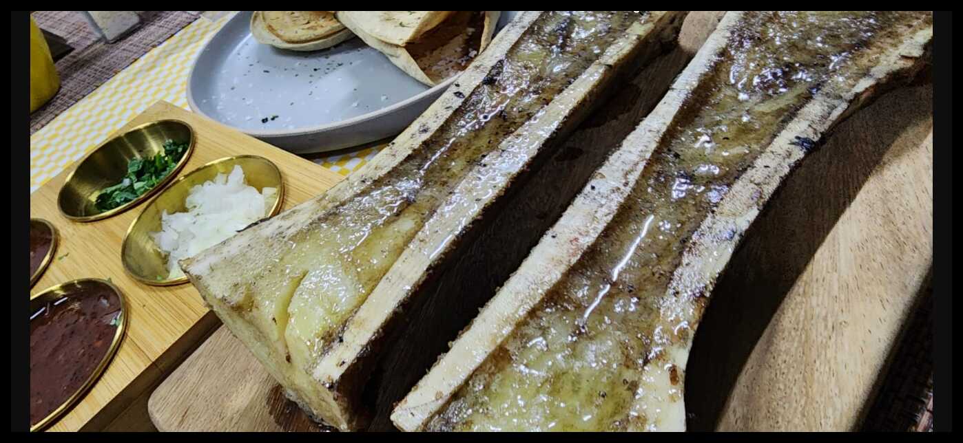Servida con un espejo de salsa pomodoro y pimientos de colores, cebolla blanca cortadas en juliana salteados al chimichurri y flameada con tequila, servidas con tortillas del día.