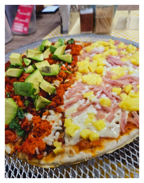 Pizza de 33 cm. Ingredientes: hecha con masa delgada crujiente, preparada con salsa martajada de la casa, queso mozarela, cilantro, cebolla, aguacate en cuadros y carne de su preferencia.