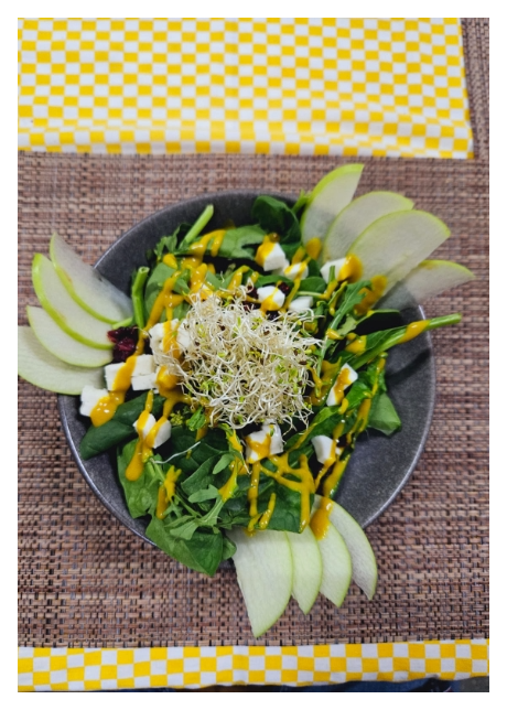 Una combinación de espinaca popeye y arugula fresca con aderezo de mostaza y miel, con gajos fileteados de manzana verde, queso de cabra y almendras fileteadas.