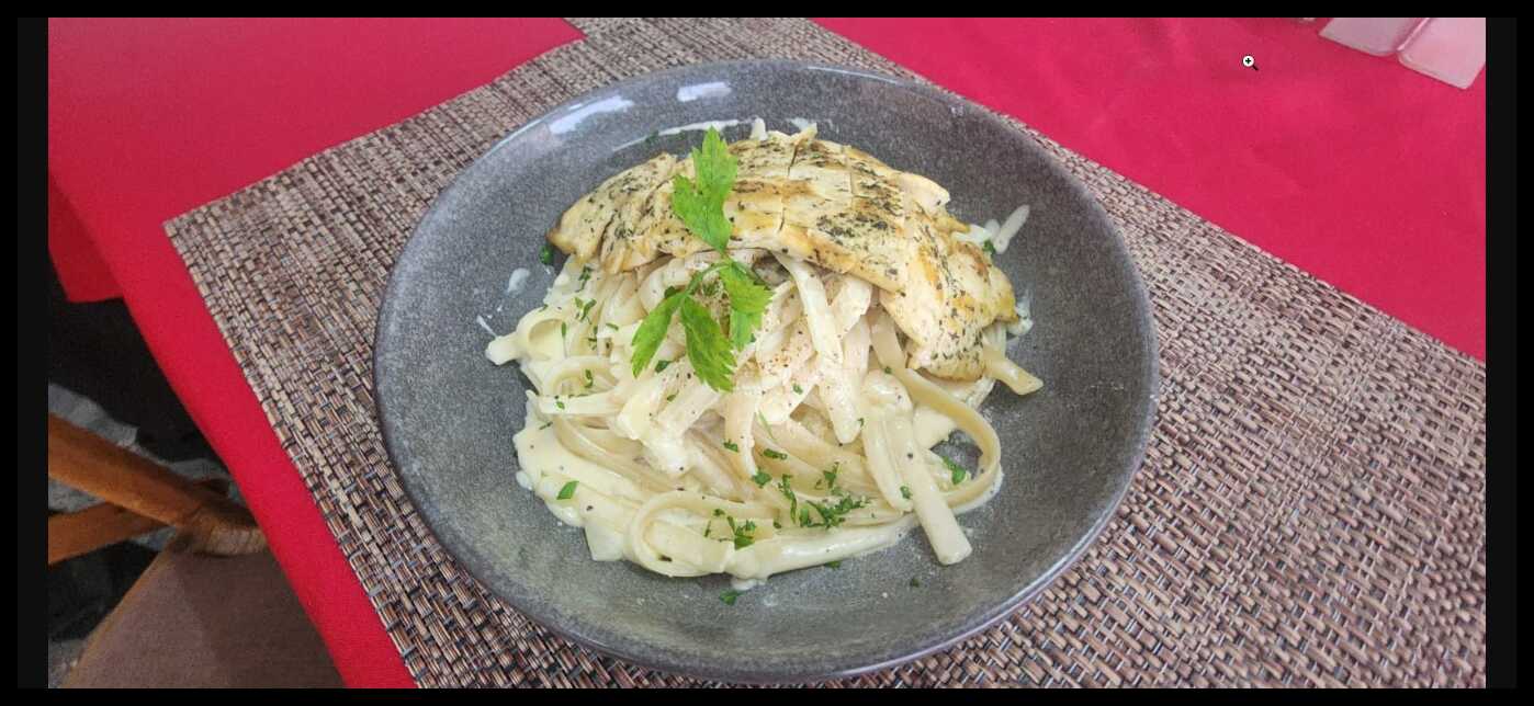 Pasta fettuccini servido con una salsa cremosa alfredo, hecha al momento, con unos toques de perejil, ingredientes extras para agregar pollo a la plancha sazonado con especies o pollo empanizado.