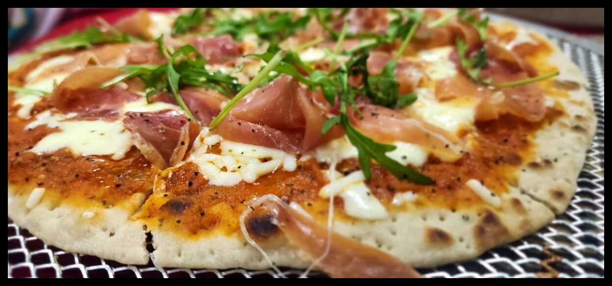 Pizza de 33 cm. Ingredientes: hecha con masa delgada crujiente, preparada con jamón serrano, queso parmesano con hoja de arugula, queso mozzarella con salsa pomodoro.