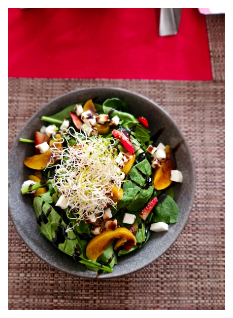 Espinaca popeye servida con fresas y durazno en miel, fileteado, combinada con reducción de balsámico y queso de cabra cenizo.