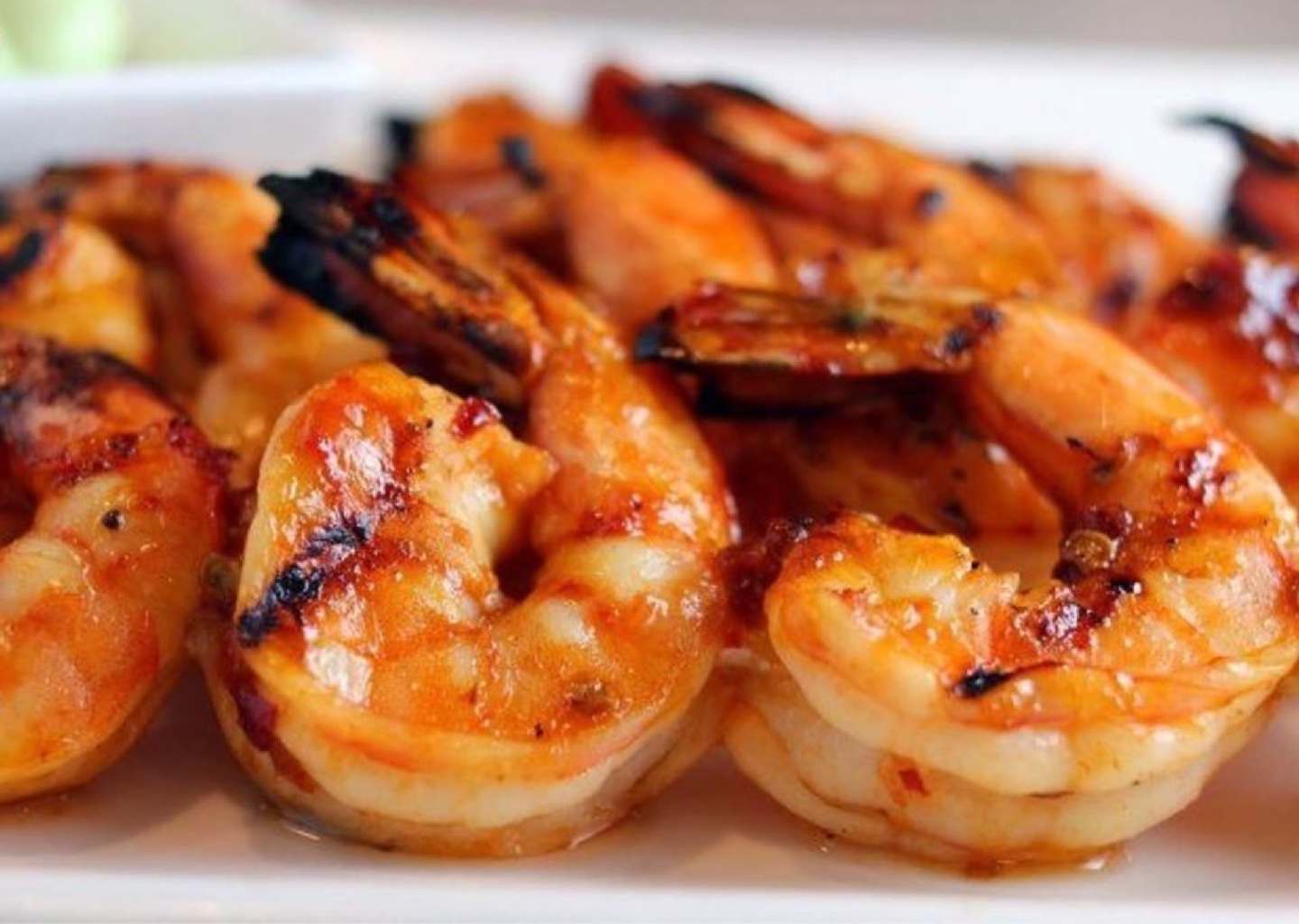 Camarones a la plancha con carne a la parrilla en cama de ensalada.