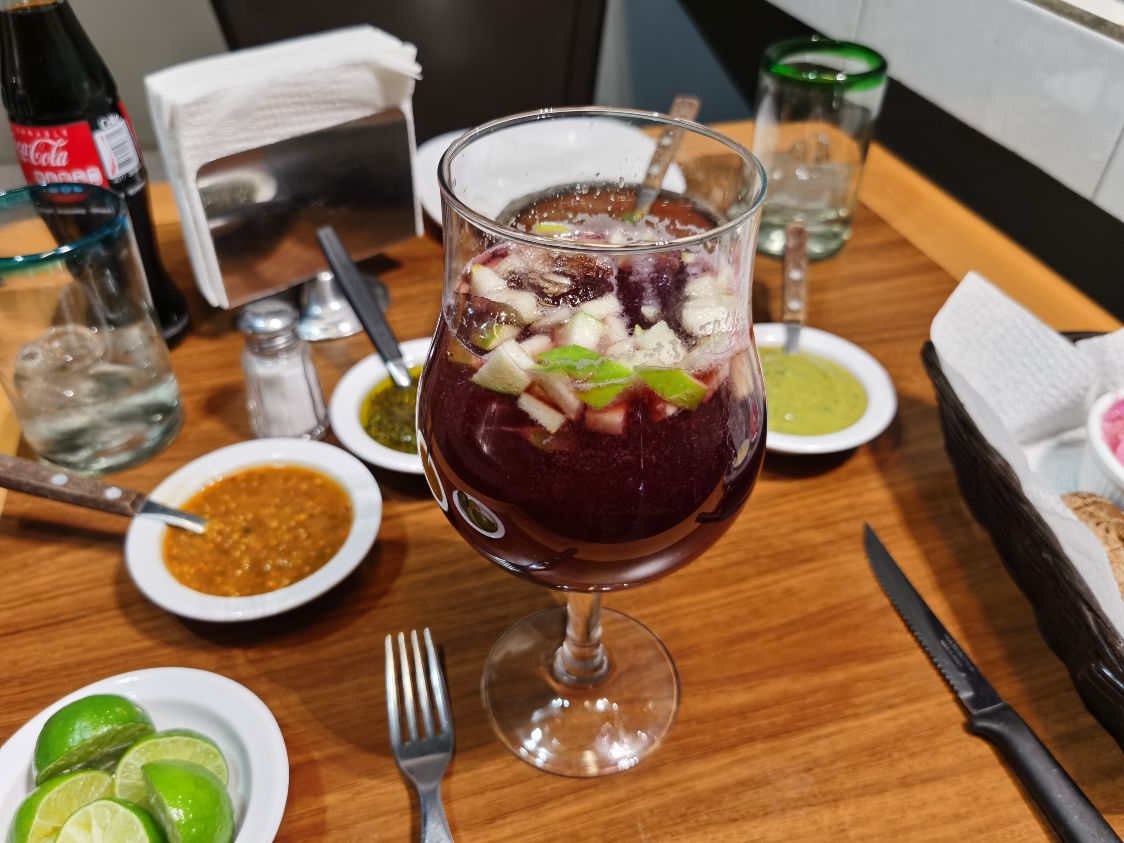 Deliciosa preparación de vino tinto de la casa con limonada y fruta fresca.