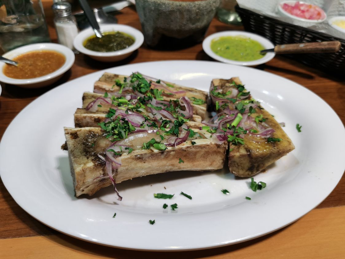 Deliciosos huesos partidos por mitad preparados al horno, condimentados con cebolla morada, cilantro y un toque de sal de mar.