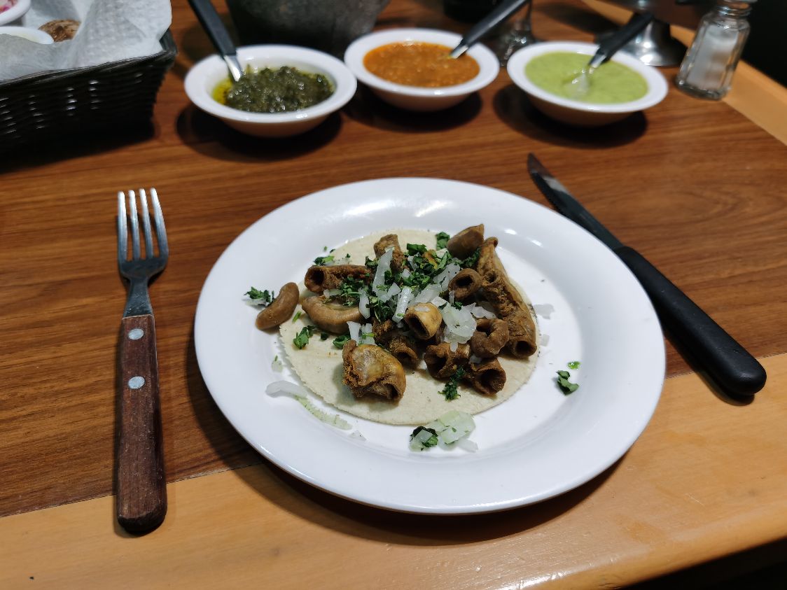 Tripitas doradas crujientes servidas en tortilla de maíz.