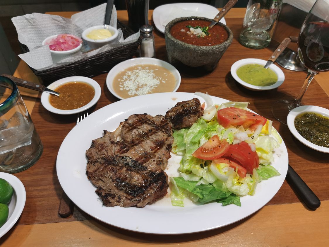 Filete con hueso cocinado a la parrilla acompañado de ensalada de tu preferencia y frijoles refritos o de la olla.