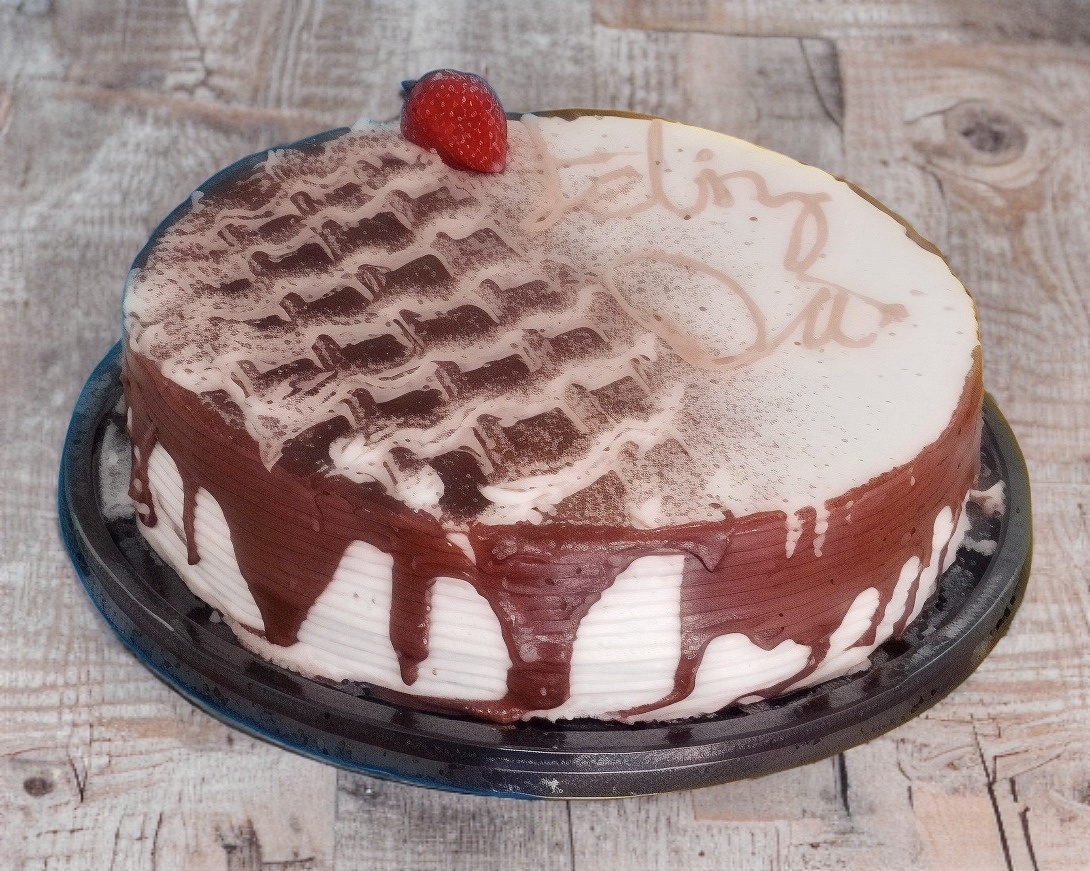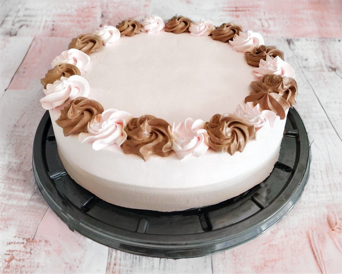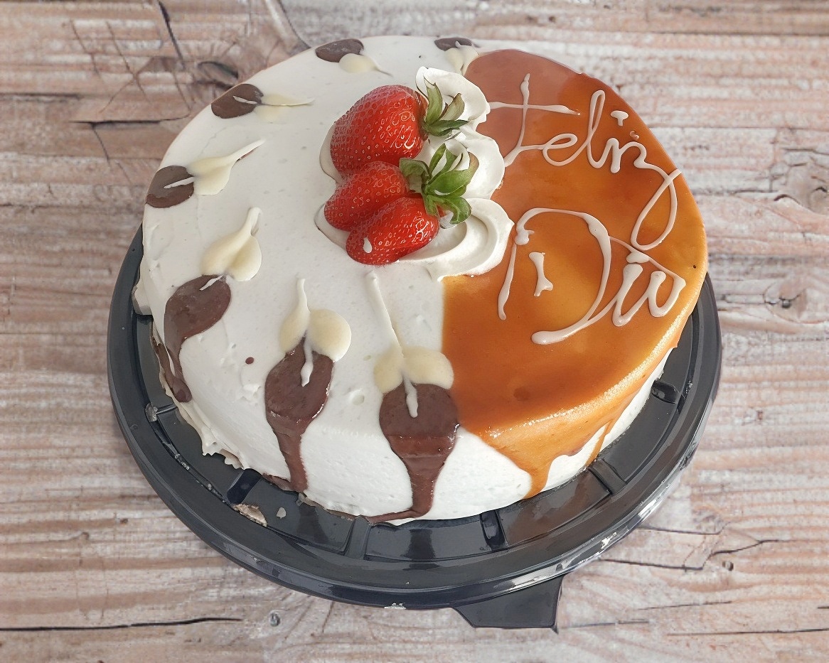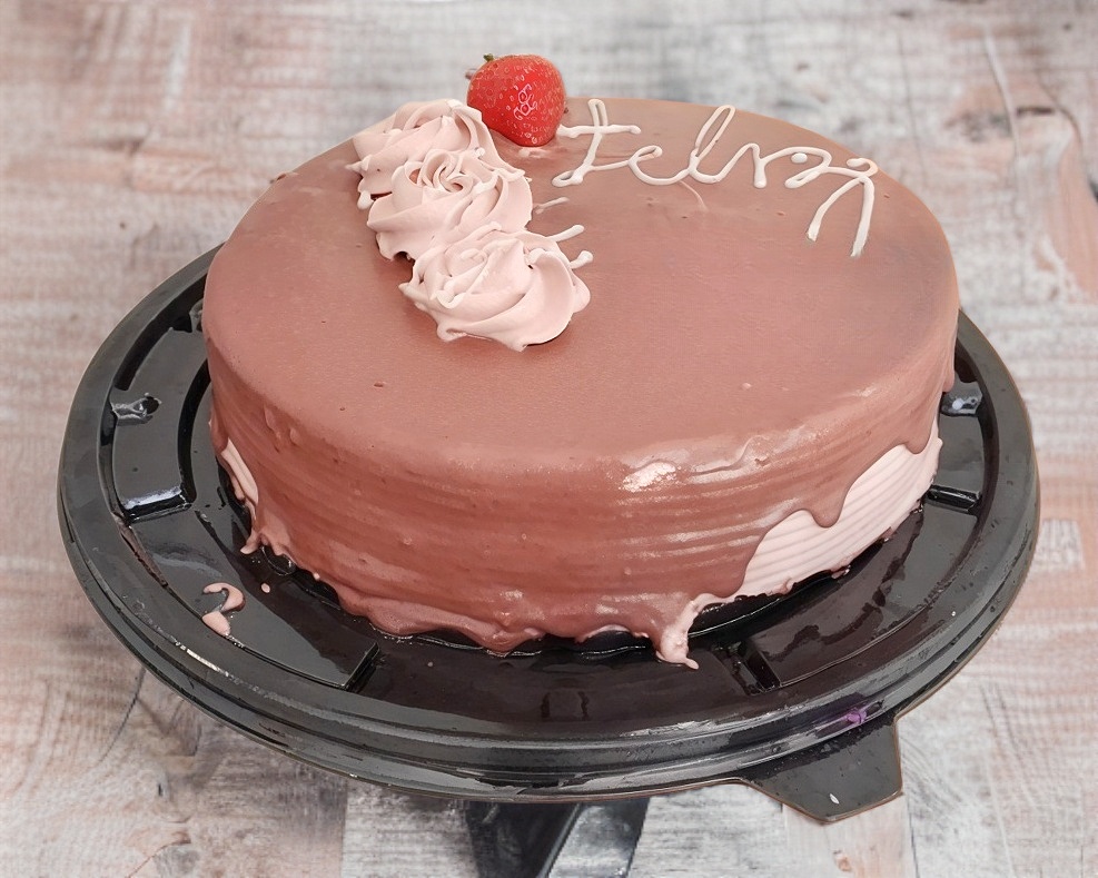 Pan suave de vainilla más pan de chocolate, relleno de nuestra crema casera con intenso sabor a chocolate y fresa.