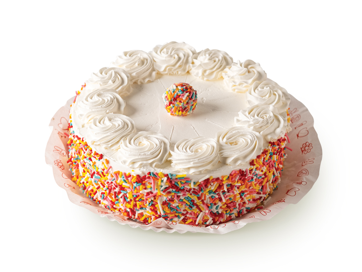 • Pastel helado cubierto con sprinkles, relleno de helado de vainilla y pan de chocolate, coronado con una deliciosa y colorida truffeld.