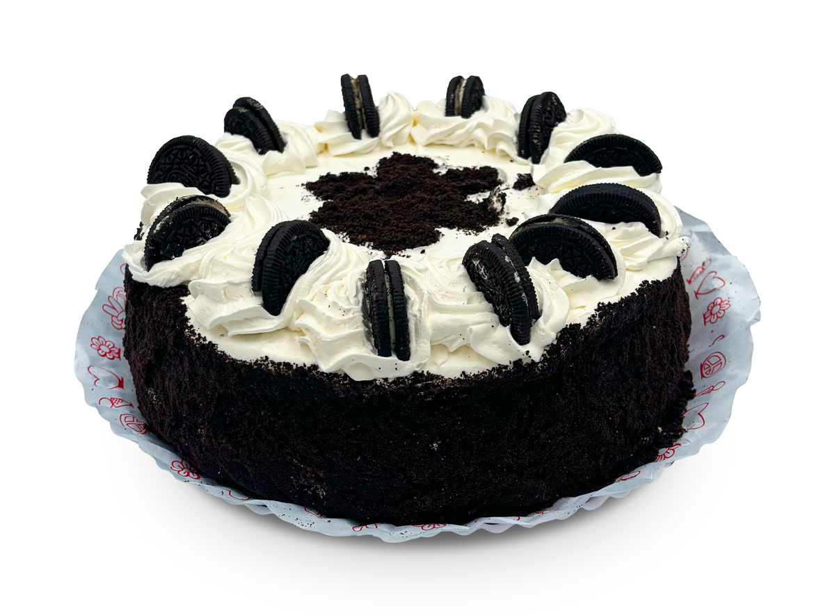 Delicioso pastel con pan de chocolate, relleno de nuestro helado sabor Oreo, decorado con crema batida y trozos de Galleta