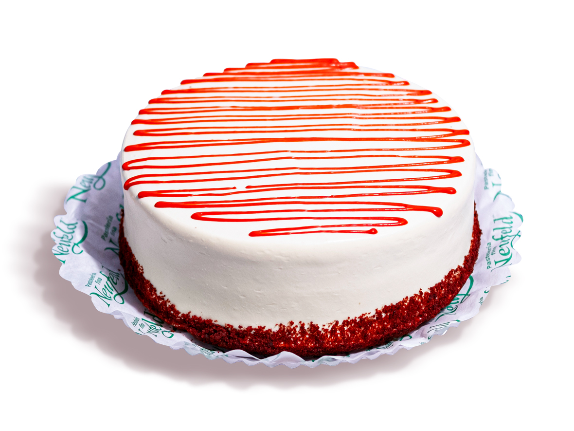 Pan Red Velvet, relleno con una capa de chocolate belga y otra capa de chocolate blanco “Crunch” con trozos de nuez, cubierto con una crema de queso Philadelphia.