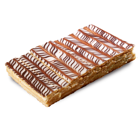 Clásico postre Francés elaborado con crocantes capas de hojaldre, rellenas con nuestra exquisita crema pastelera, decorado con glasé y líneas de chocolate.