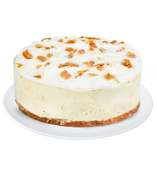 Delicioso pastel de helado inspirado en el sabor de deliciosas trufas de chocolate blanco, con centro de frambuesas naturales y trocitos de avellana, coronado con suave crema batida, lluvia de coco y almendras tostadas.