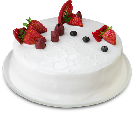 Pan de cocoa con un ligero baño de cítricos y ron, relleno con una suprema crema de vainilla y trozos de fresas, cubierto con ganache de chocolate blanco y decorado con frutos rojos y chocolate.
