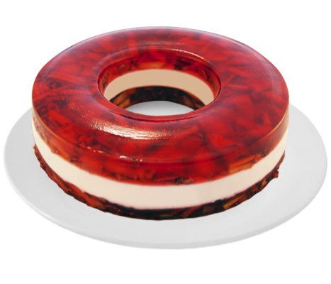 Gelatina de frutas, rellena de manzana, fresa y nuez con una capa intermedia de gelatina de leche con queso.