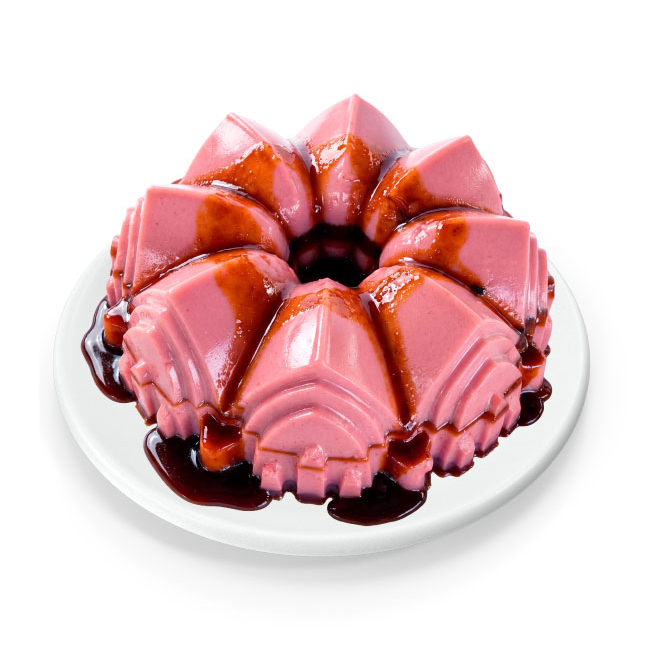 Gelatina de frutas, rellena de manzana, fresa y nuez con una capa intermedia de gelatina de leche con queso.