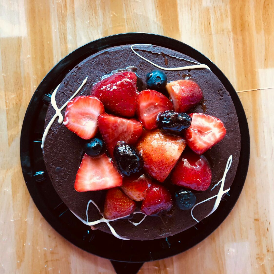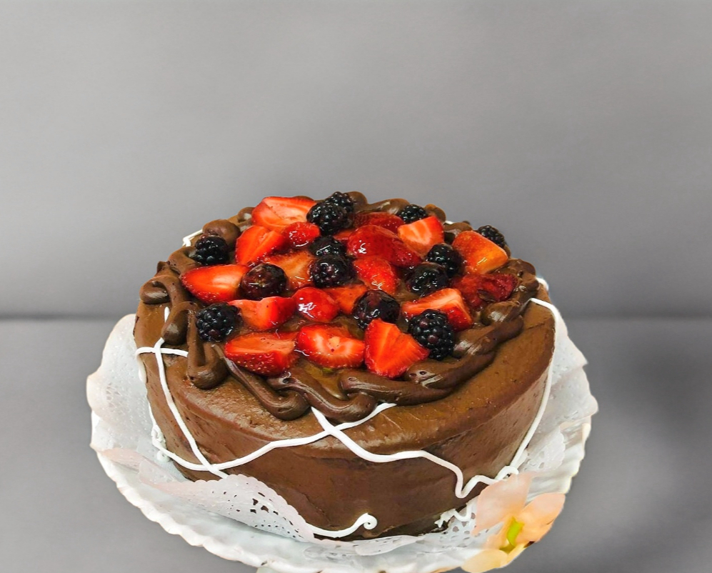 Es una deliciosa creación que combina tres tipos de chocolate en su interior y en su cubierta. Cada sabor de chocolate presente en este pastel es un verdadero regalo para los amantes de este exquisito ingrediente decorado con fresas y zarzamoras que le da un toque de elegante sabor. Rinde de 16 a 20 personas.